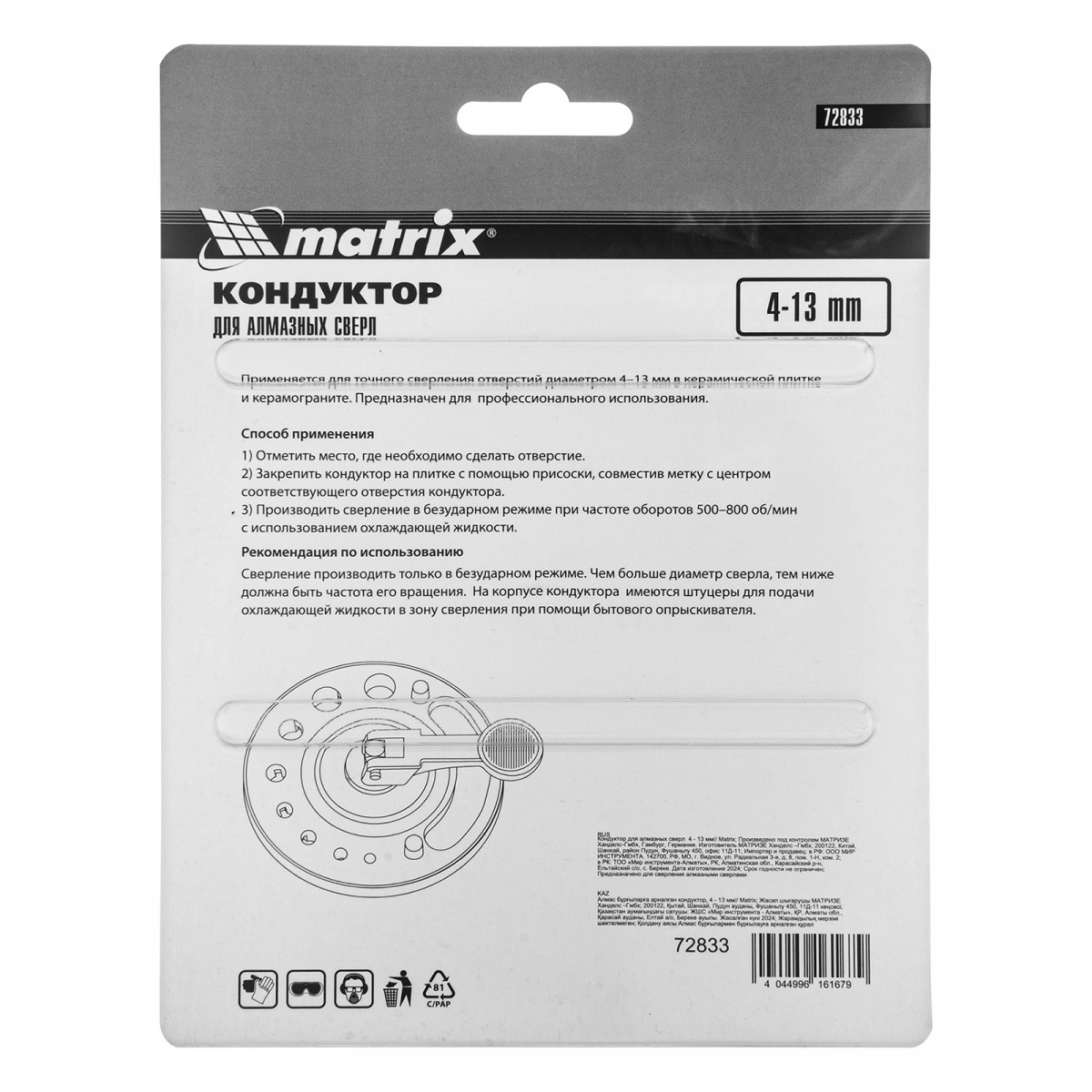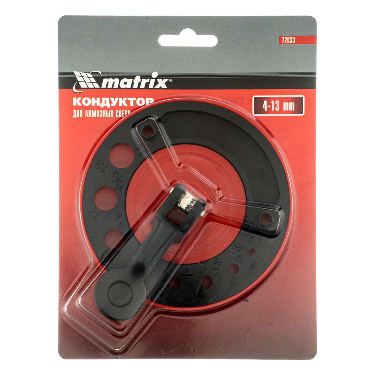 Кондуктор Matrix 72833 позволяет точно позиционировать алмазные сверла и коронки размером 4-13 мм. Отверстия, соответствующие диаметрам сверл, облегчают установку оснастки в нужное положение. Кондуктор препятствует сдвигу сверла (коронки) и облегчает засверливание. Изделие используется для работ по керамической плитке, граниту, керамограниту, стеклу и мрамору.
