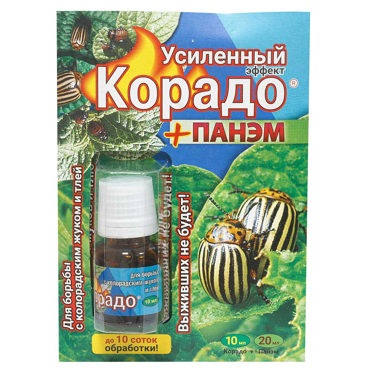 Усиленный эффект достигается благодаря специальному прилипателю «Панэм». Более прочный контакт с листьями и покровами вредителей, большее и лучшее проникновение действующего вещества в организм насекомых и листовые пластины, меньше потерь препарата из-за стекания с листьев и испарения в жаркую погоду.