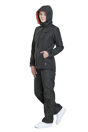 Удобный и современный женский костюм для прогулок и активного отдыха на природе. Из современной трехслойной ткани ПОНЖИ. Ткань прочная и дышащая, с водоотталкивающим покрытием, быстро сохнет и обеспечивает воздухообмен. В этой куртке вы будете чувствовать себя защищенной от влаги и ветра в холодное демисезонье. Приталенная куртка на молнии удлиненная сзади с двумя карманами в рельефах и одним внутренним будет удобна вам по фигуре. Капюшон с регулировкой по объему и глубине защитит лицо от влаги и ветра. Комбинезон с завышенной талией сзади небольшой спинкой для защиты от холода.