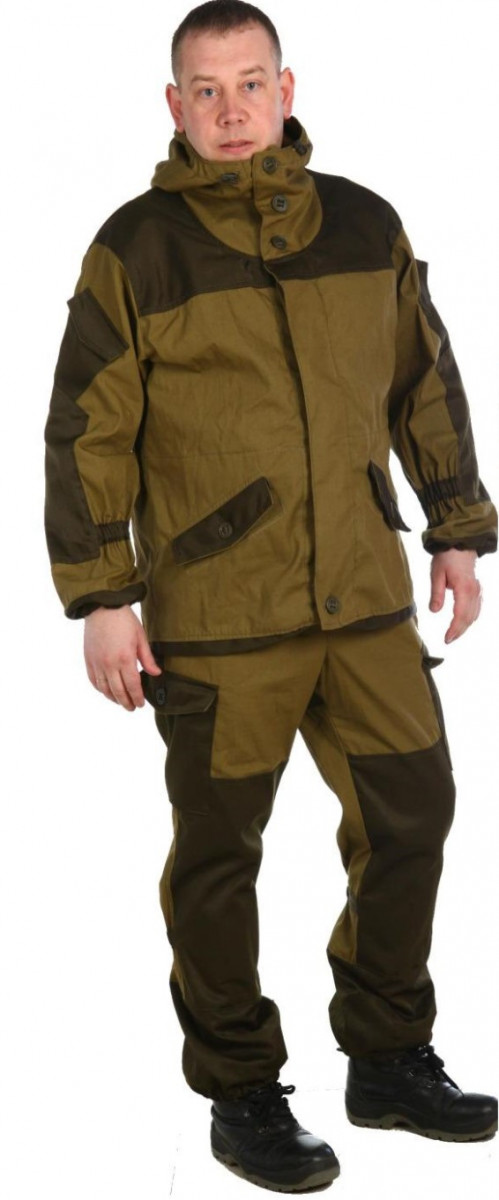 Застежка куртки выполнена на канадских пуговицах, пришитых прочной стропой. Капюшон имеет два вида регулировки (утяжки) шнуром с фиксаторами: сзади – регулируется объем капюшона и по бокам – регулируется по овалу лица. На куртке располагаются 5 карманов: 2 нижних с застёжкой на канадской пуговице с клапанами, 2 кармана на рукавах - на липучке и один внутренний накладной на пуговице. Понизу куртка регулируется утяжками со шнуром и фиксатором, а также имеются утяжки на резинке в уровне талии. Куртка усиленна налокотниками и наплечниками с двойной строчкой. Брюки также утеплены флисом, имеют гульфик на пуговицах и идут в комплекте со съемными подтяжками. На талии брюк имеются утяжки на резинке, с утягивающим шнуром и усиленными шлёвками под ремень. На брюках имеются 6 карманов: 2 прорезных на бёдрах, 2 кармана чуть выше колена с клапанами и с застёжкой на пуговицу и 2 сзади с застёжкой на пуговицу. Брюки усиленны наколенниками, сзади чуть ниже колена есть утяжка из эластичной тесьмы.