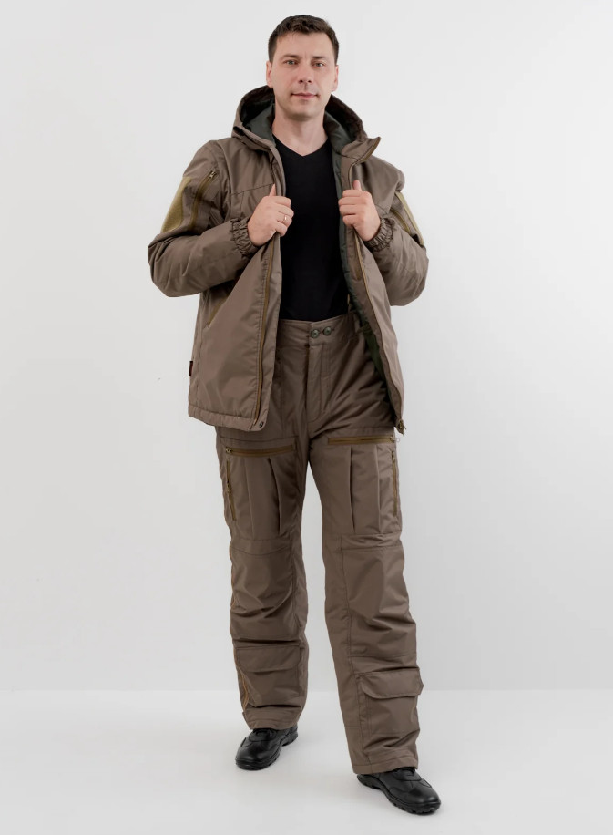 Костюм демисезонный Гром из современного курточного мембранного материала с повышенными влагозащитными и паропроницаемыми свойствами. Состоит из куртки и брюк. Куртка: регулируемый по объему и глубине капюшон. Воротник-стойка внутри отделан «Polar fleece». Центральная застежка на двухзамковую тесьму-молнию. Внутренний карман на молнии. Два кармана с застежкой на тесьму-молнию. Внутренний карман на молнии для документов. Утяжка с фиксатором по низу. Все карманы утеплены «Polar fleece». Широкие липучки на рукавах. Три прорезных кармана на рукавах с застежкой на тесьму-молнию (2 на левом, 1 на правом). Манжеты рукава на резинке. Брюки: регулируемые лямки. Широкий утепленный пояс на спинке, шлевки под ремень. Функциональные молнии на передних половинках - по всей длине. Объемные карманы с молниями. Нижние карманы с клапанами. Карман для вставки пенки на задней части брюк. Регулировка ширины низа брюк с помощью молнии и паты. Внутренние снегозащитные гетры. Костюм носить при температуре воздуха до - 10 °C.