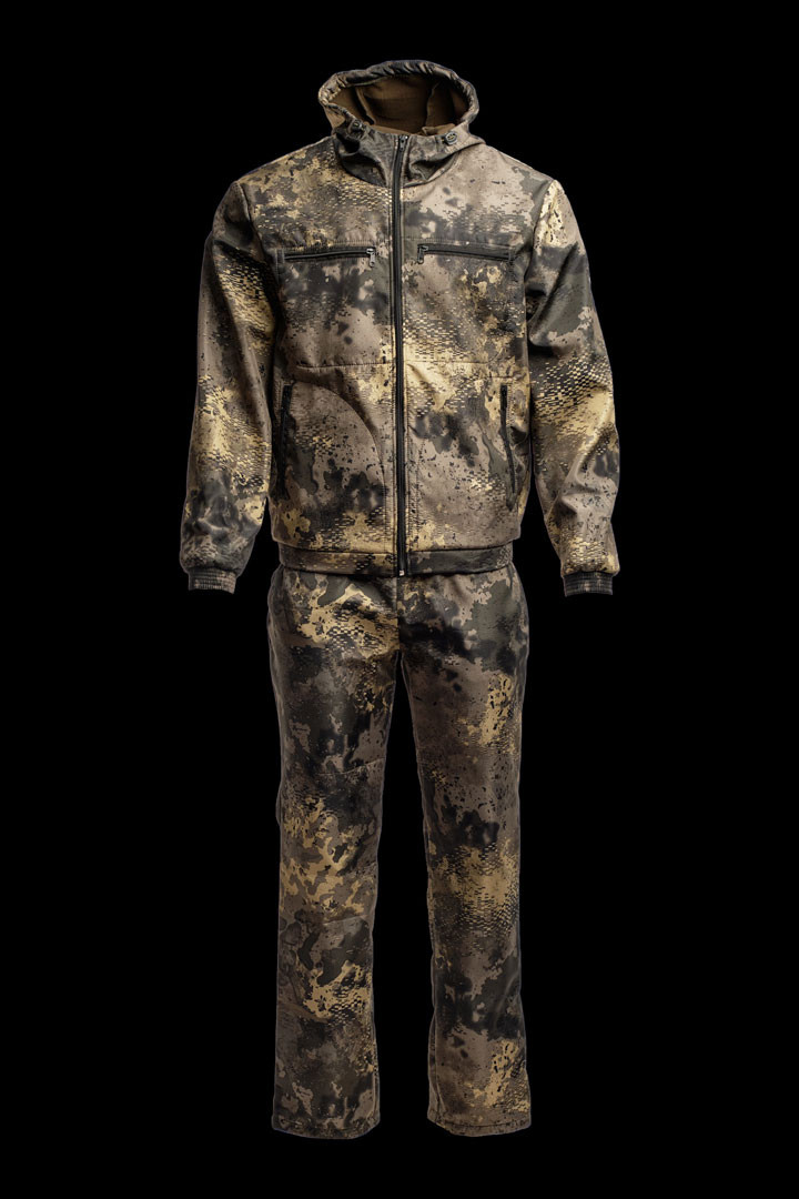 Костюм состоит из куртки и брюк, выполненных из ткани Dewspo fleece bonding (100% ПЭ), которая обладает водоотталкивающими свойствами благодаря DWR пропитке (durable water repellent).