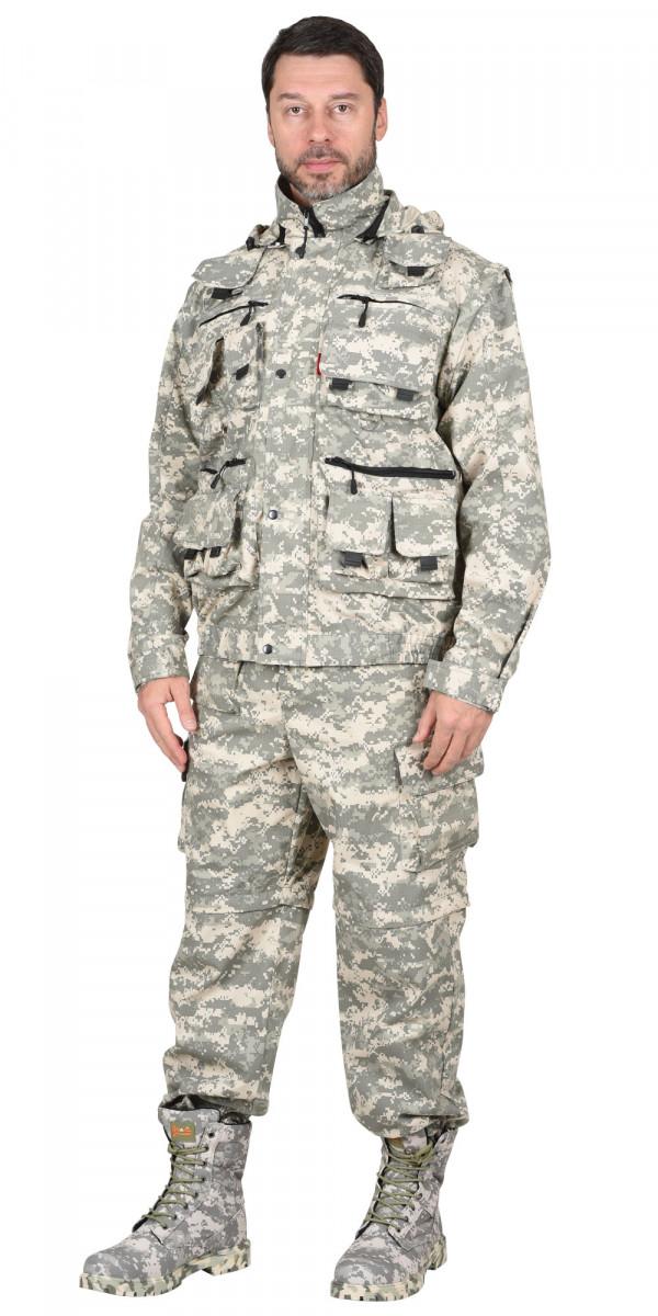 Тк."Рип-Стоп", ВО, 65% п/э., 35% х/б, 210 г/кв.м. Куртка удлинённая, прямого силуэта, с центральной застёжкой на молнию с ветрозащитным клапаном, пристёгивающимся капюшоном, различными многофункциональными карманами на «молнии», с клапанами на «липучках», складки на спинке для свободы движения. Рукава пристёгиваются на «молнию». Низ куртки с притачным поясом стянутым на резинке.