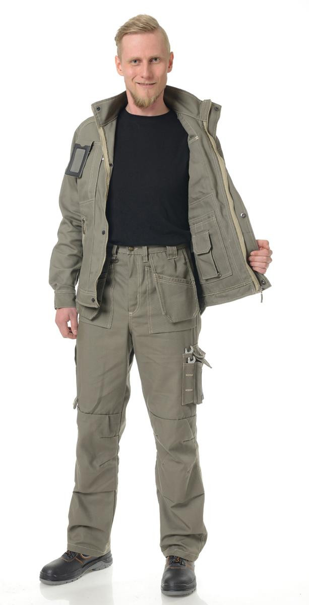 Брюки: прямые, в области коленей усилительные накладки. Пояс со шлевками для ремня. Большое число навесных и накладных карманов.