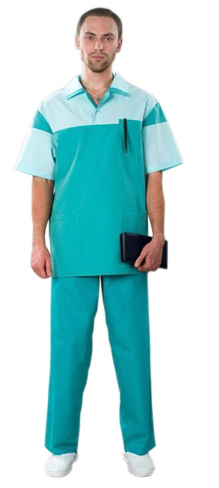 Элегантная модель мужской блузы прямого кроя. Отложной воротник, один нагрудный и два боковых кармана. Рукав короткий. Брюки прямого кроя на резинке.