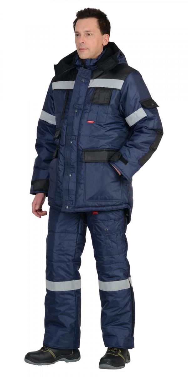 Куртка длинная прямого силуэта, с центральной застёжкой на 2-х замковую тесьму-«молнию», двумя внешними ветрозащитными планками с 5-ю кнопками и 5-ю текстильными застёжками-«липучками» длиной 4,5см Воротник-«стойка». Подкладка в куртке полочка и спинка состоит из двух частей: верхние части полочек и спинки (из ткани флис), а нижние части полочек и спинки из ткани Таффета. В куртке и п/комб. предусмотрен СОП шириной 50мм для обеспечения сигнальной видимости в условиях пониженной видимости. Полукомбинезон прямой, с притачной утеплённой подкладкой, с цельнокроеной грудкой и отрезной спинкой, с центральной застёжкой на 2-х замковую тесьму-«молнию» и внутренним ветрозащитным клапаном, с боковыми накладными карманами с фигурным входом В куртке предусмотрены СОП шириной 50мм Ткань: "Оксфорд" 100% п/э пов. плотность 100г/м2. Подкладка: "Таффета" 100% п/э. Утеплитель: "Холлофайбер" 360 г/м2. ГОСТ Р 12.4.236-2011