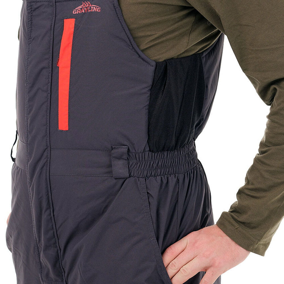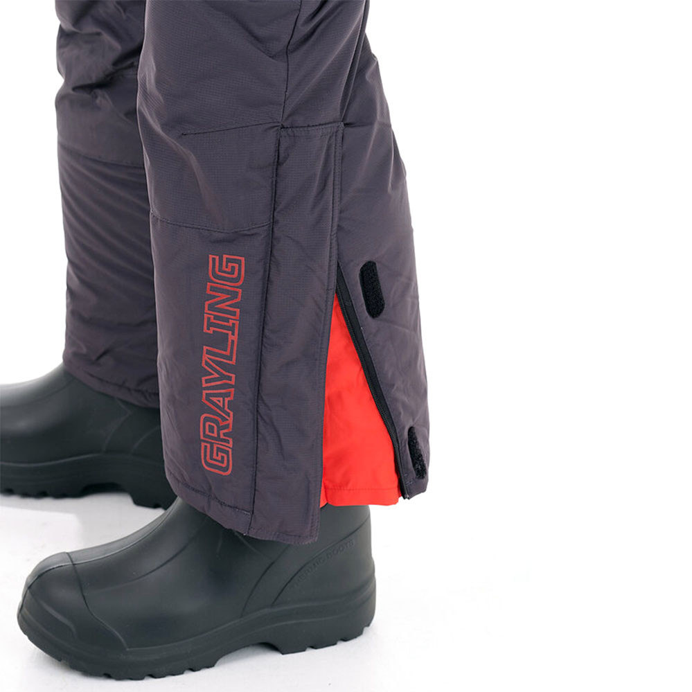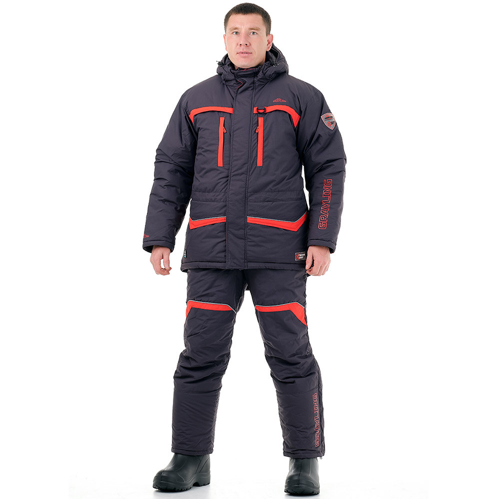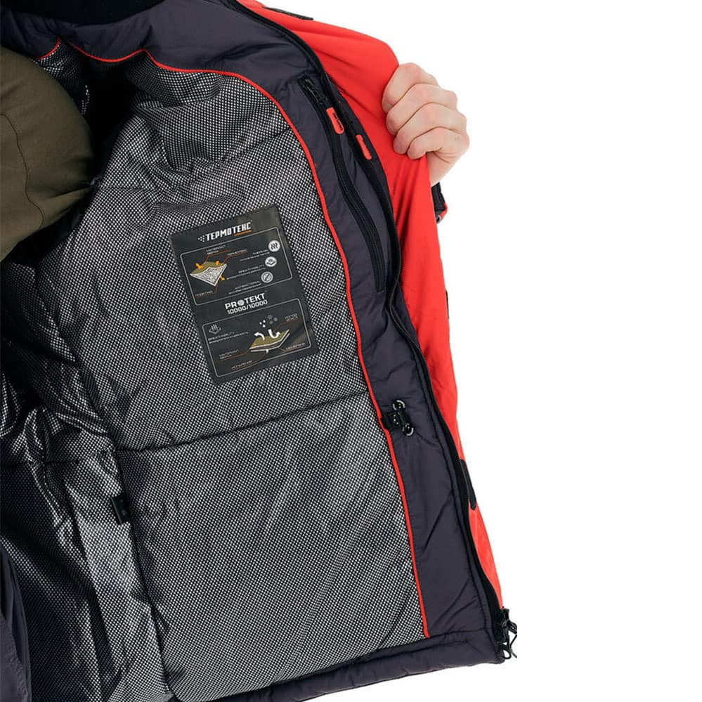 Куртка прямого силуэта удлинена по спинке, закрывается на двухзамковую молнию и ветрозащитную планку на липучках и кнопках. Нагрудные и нижние карманы с флисовым подкладом на молниях защищены листочками контрастного цвета. Внутренний карман для документов на молнии. Имеется также дополнительный карман для телефона под ветрозащитной планкой, утепленный флисом. Куртка регулируется по талии внутренней кулиской утяжкой из шляпной резинки с фиксаторами. Рукава дополнены регулируемыми неопреновыми манжетами. Высокий воротник утеплен флисовым подкладом. Съемный капюшон регулируется по высоте патой на липучке, по овалу лица – шляпной резинкой с фиксаторами. На груди имеется D-образное кольцо для подвешивания инструмента. Крупные пуллеры-кольца дают возможность расстегивать карманы не снимая перчаток. Высокие брюки-полукомбинезон регулируются по высоте эластичными бретелями. Пояс брюк на спинке собран на широкую резинку, дополнен шлевками. Застегивается комбинезон на двухзамковую молнию с планкой на липучках.