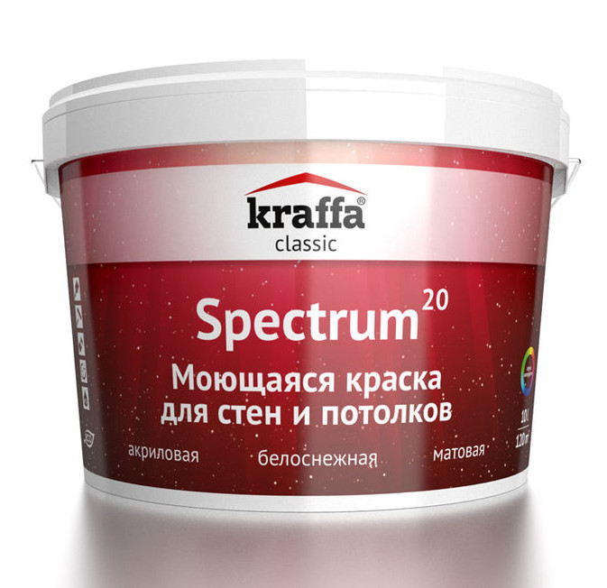 Краска моющаяся для колеровки в насыщенные тона Kraffa Spectrum20. Высококачественное сырье, используемое для Kraffa Spectrum20, создает износостойкую пленку, которая не пожелтеет и не изменит свой цвет даже через 2-3 года. Безукоризненно белая моющаяся краска настолько прочна к мокрому истиранию, что может использоваться даже в наружных условиях. А благодаря легкой колеровке с помощью водных пигментных паст, можно получить любой, даже сложный оттенок. Спектрум 20 применяется при текущих ремонтах и реконструкциях в крупнейших Бизнес- и торговых центрах.