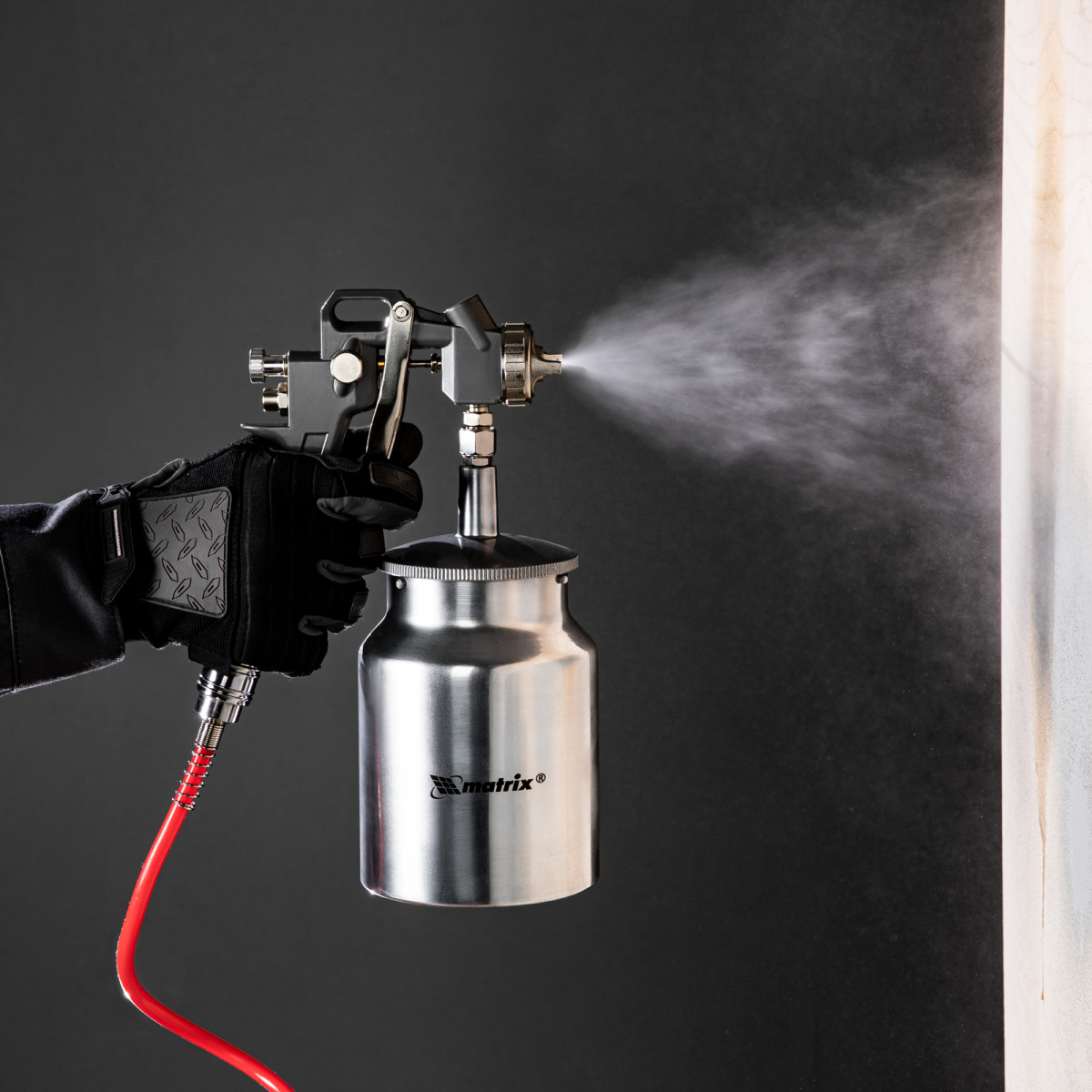 Пневматический краскораспылитель Matrix 57316 с нижним бачком объемом 1,0 л и соплами диаметром 1,2, 1,5 и 1,8 мм используется для окрашивания металлических, деревянных, керамических и пластмассовых поверхностей. Благодаря сменным соплам краскораспылитель может работать с различными по густоте составами: лаком, шпаклевкой, краской. Он пригодится на стройке, в автомастерской и на мебельном производстве.