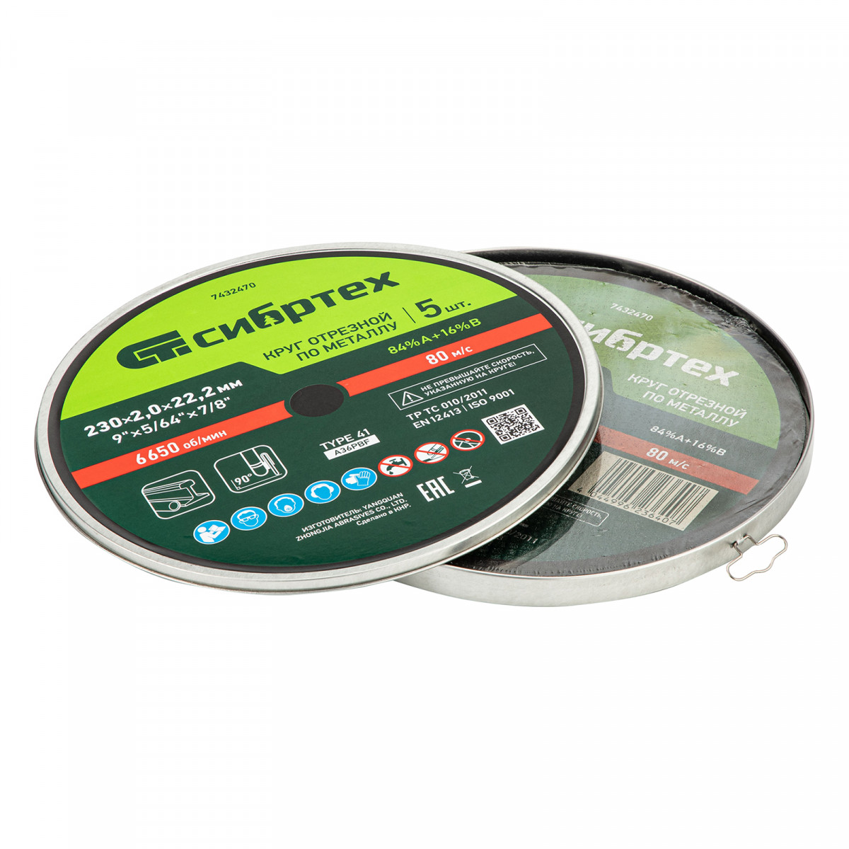 Круг отрезной по металлу, 230 х 2,0 х 22,2 мм, 84%A+16%B, в метал.банке, 5 шт. Сибртех
