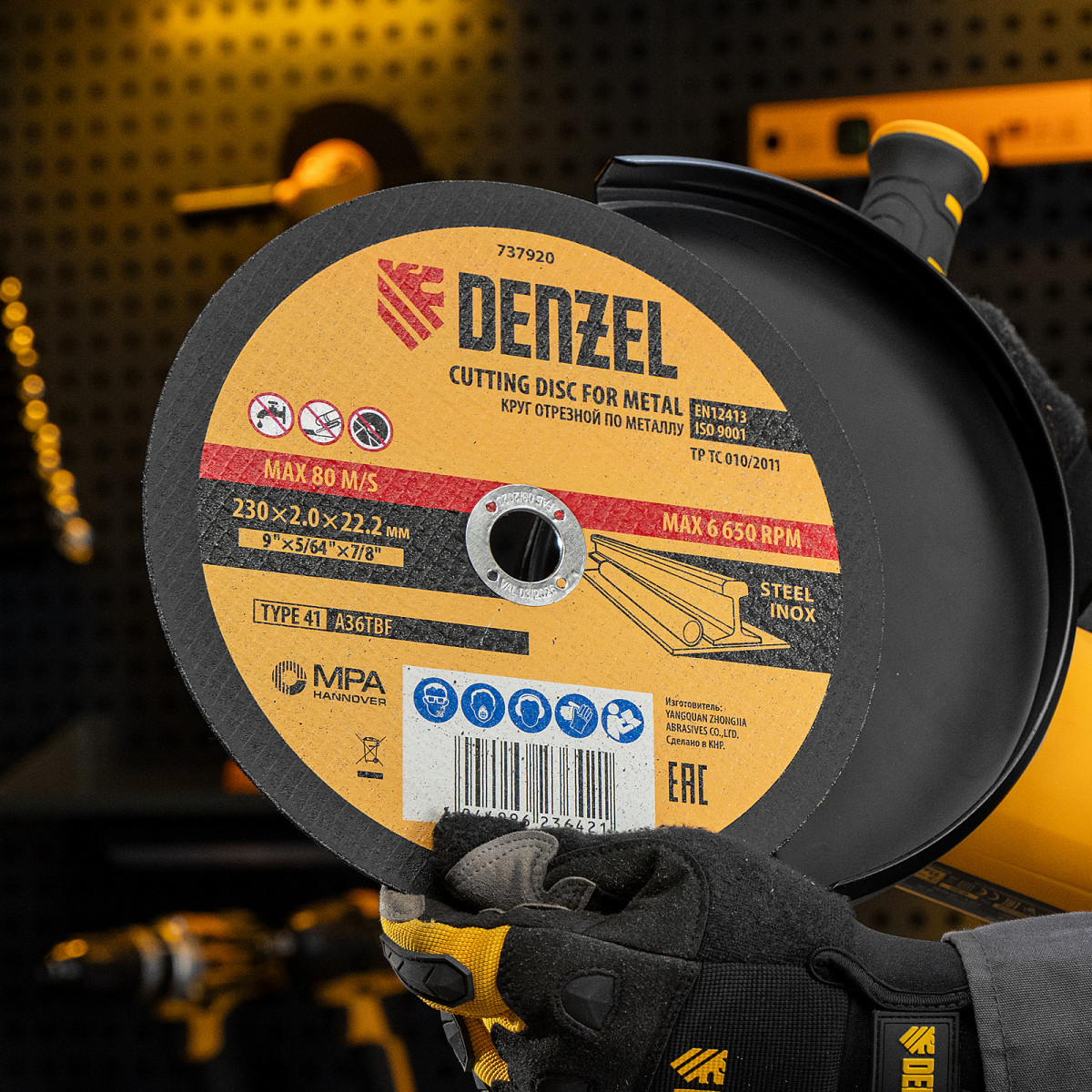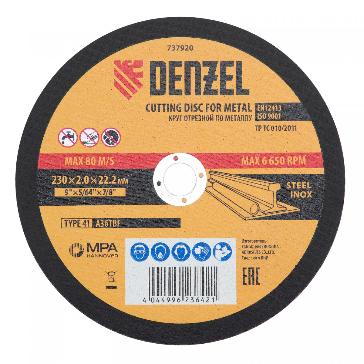 Круг отрезной по металлу Denzel 737920 (A36TBF) размером 230 х 2,0 х 22,2 мм, 5 шт. в металлической банке, устанавливается на УШМ соответствующего типоразмера. Универсальная оснастка подходит для резки легированных (нержавеющих) и углеродистых (черных) сталей. Набор предназначен для профессионального использования и большого объема работ (сухой рез).
