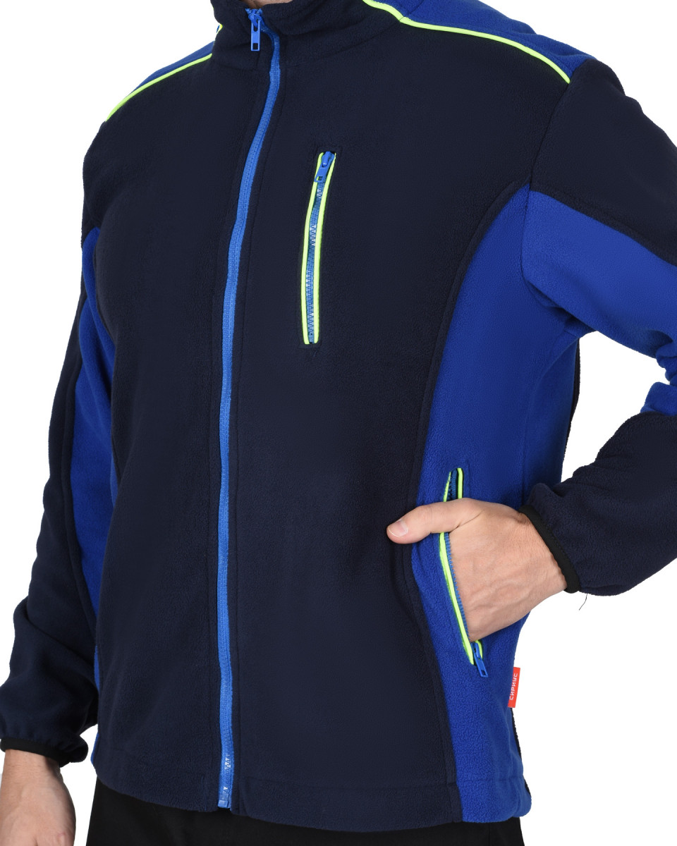 Куртка, комбинированная из флиса двух цветов, отделка лимонным кантом, без подкладки, прямого силуэта, с центральной застежкой на молнию. С тремя карманами на молнии. Рукава втачные, понизу присобраны на окантовочную резинку. ГОСТ 25295-2003