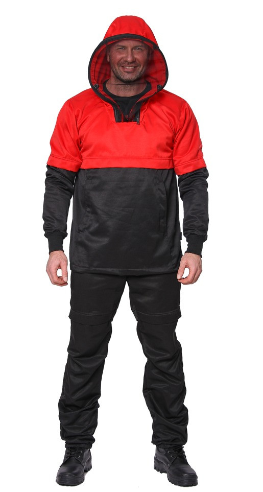 Куртка: - анорак (без распашной застежки), спереди один большой накладной карман с двумя входами по бокам, входы выполнены с помощью листочек и застегиваются на липу. Капюшон не отстегивается, имеет регулировку в средней части хлястиком на липе по высоте и утягивается шнуром по лицевому краю. Есть защитная сетка на лицо, можно отстегнуть и убрать в потайной карман. Низ рукавов с трикотажными манжетами по запястью. Имеются ловушки на рукавах и в области груди. Гиз куртки утягивается шляпной резинкой с двух сторон.