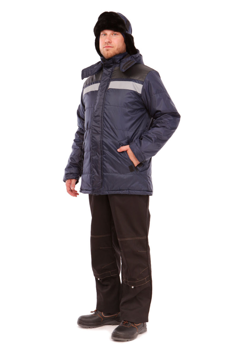 Куртка: прямого силуэта, с застежкой на молнию с верхним утепленным ветрозащитным клапаном. Рукава втачные одношовные с притачной манжетой с застежкой на контактную тесьму. Воротник стойка.