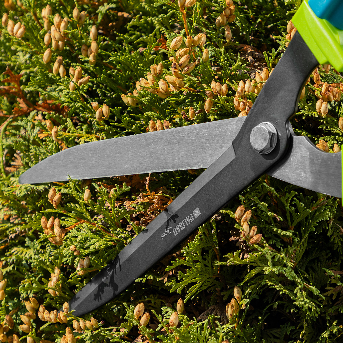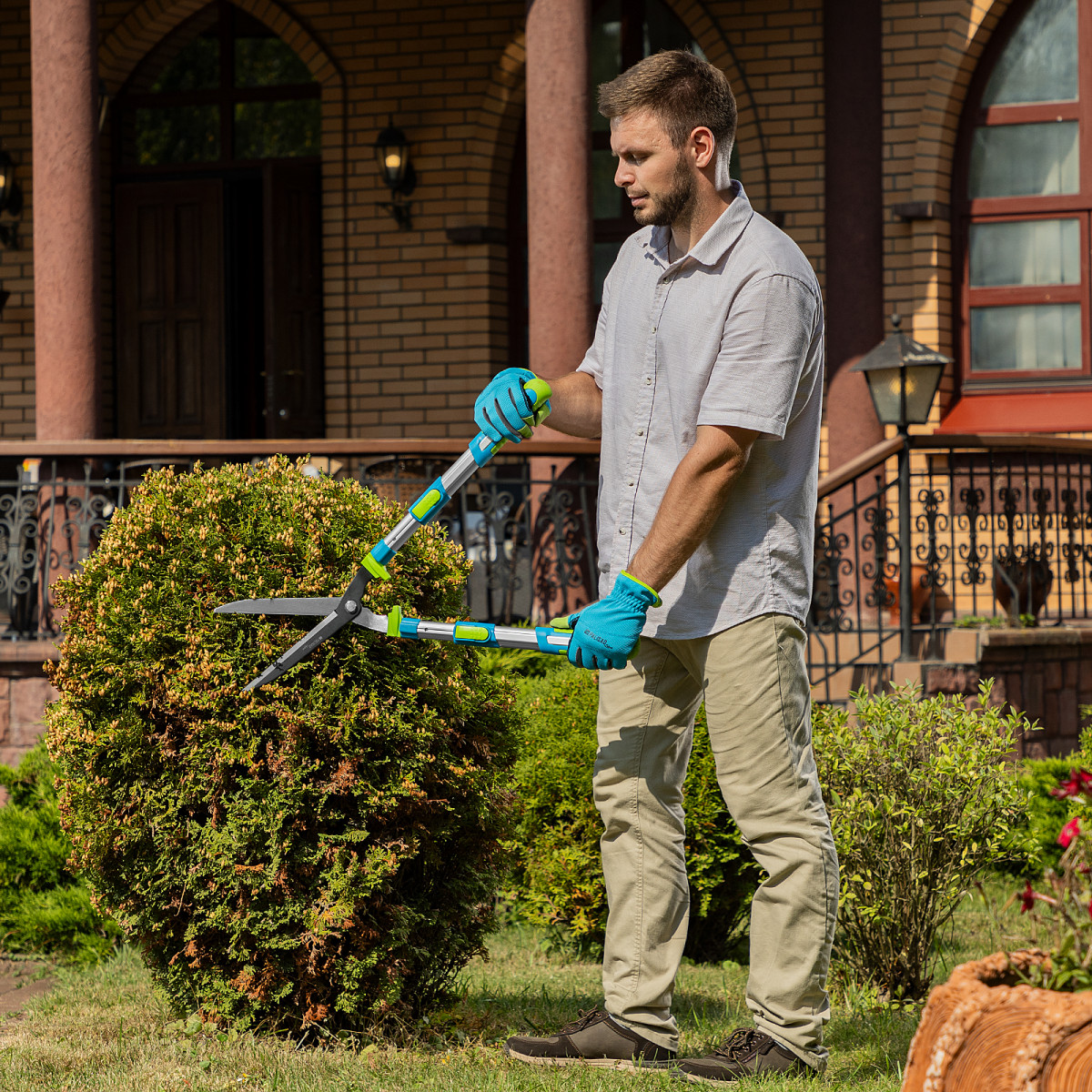 Кусторез Palisad LUXE 60592 с телескопическими алюминиевыми рукоятками, регулируемыми по длине от 640 до 820 мм, используется садоводами для стрижки кустов и живых изгородей на дачном участке. Успешно справляется с обрезкой молодых веток толщиной до 10 мм. Телескопические рукоятки облегчают работу на высоте и в труднодоступных местах.