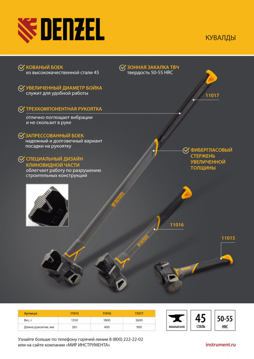 Кувалда Denzel 11017 с клиновидным бойком весом 3,6 кг и фибергласовой рукояткой с TPR-покрытием предназначена для проведения демонтажных работ. Удлиненная рукоятка позволяет наносить удары большой силы. Две рабочие зоны делают инструмент универсальным в работе: клиновидный боек позволяет разрушать кирпичную кладку, конструкции из бетона и камня, а плоский боек — забивать большие гвозди, колья, клинья и выполнять другие ударные работы. Кувалда также подходит для правки автомобильных дисков и проведения сборочных работ. Рекомендована для профессионального применения.