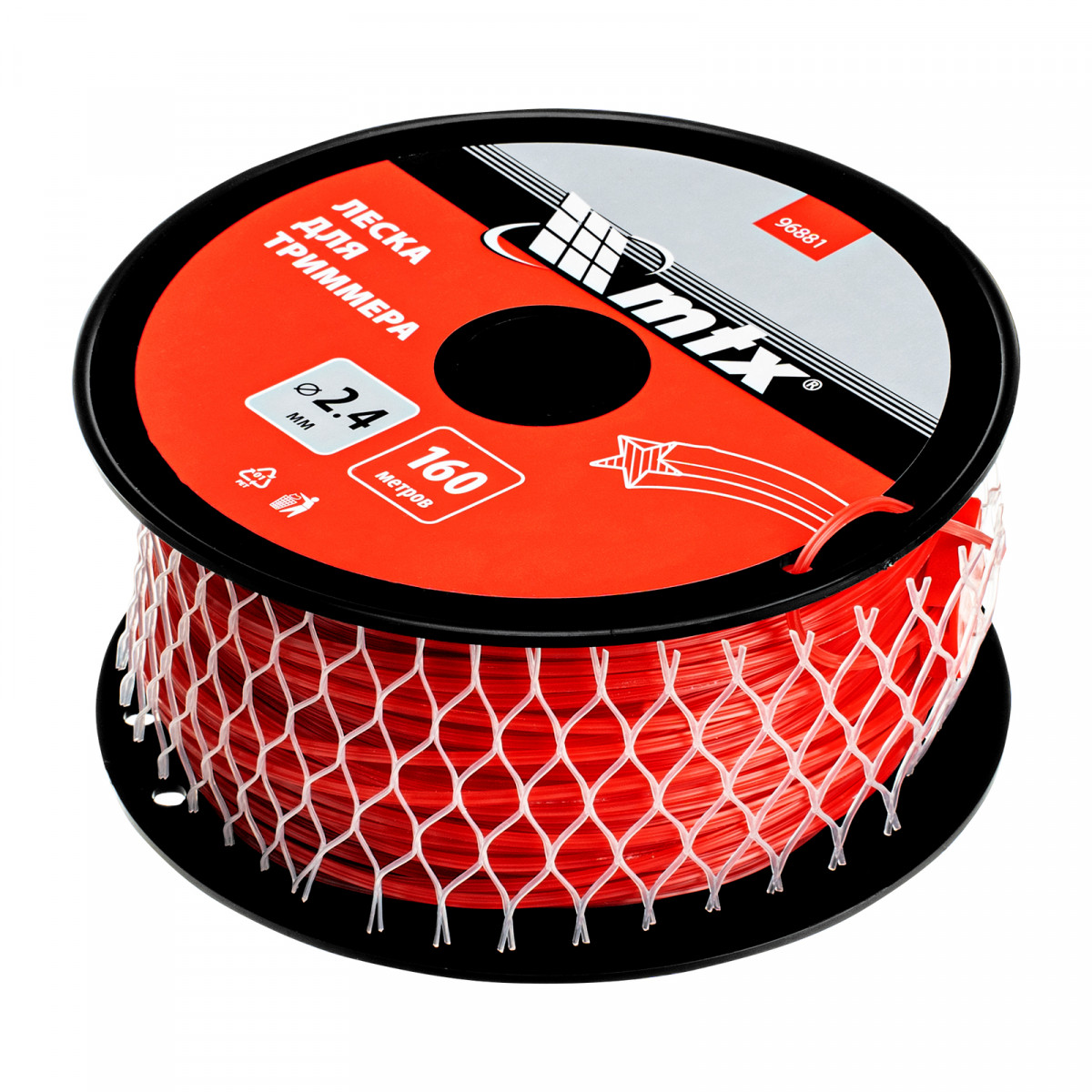 Леска для триммера MTX 96881 с сечением «звезда», толщиной 2,4 мм и длиной 160 м, поставляется на катушке и позволяет скашивать мягкую, молодую траву, а также густую и жесткую растительность. Используется в качестве режущего элемента для бензиновых триммеров. Пригодится на дачном участке, а также для ухода за газонами на придомовой территории, в скверах и т.д.