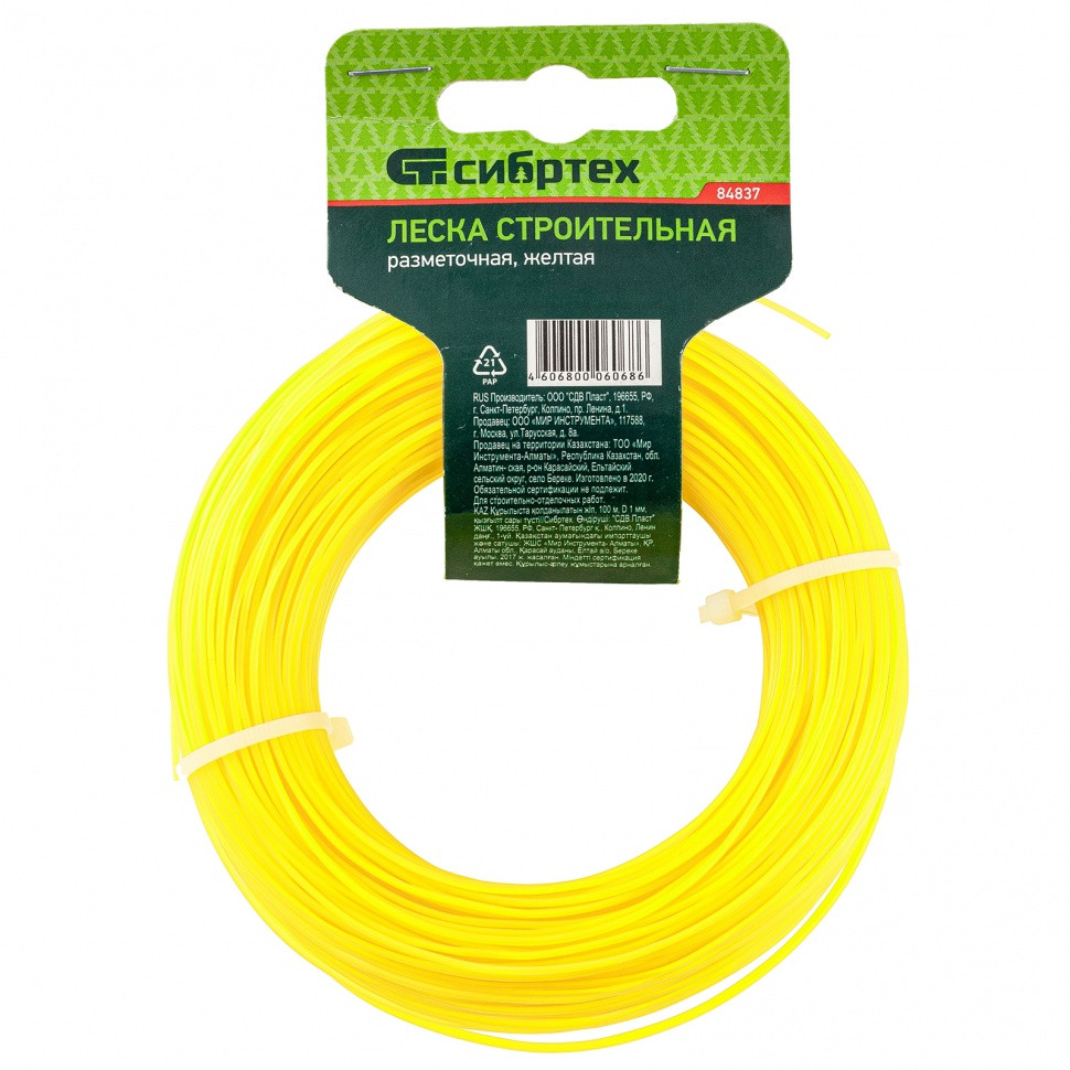Леска строительная Сибртех 84837, длина 100 м, диаметр 1 мм, желтого цвета, пригодится на строительной площадке как ориентир при укладке материалов, установке конструкций.