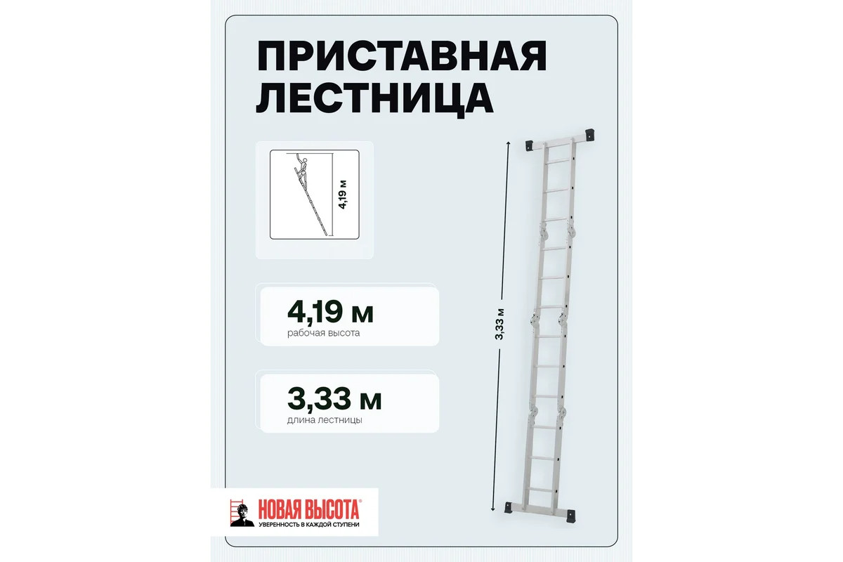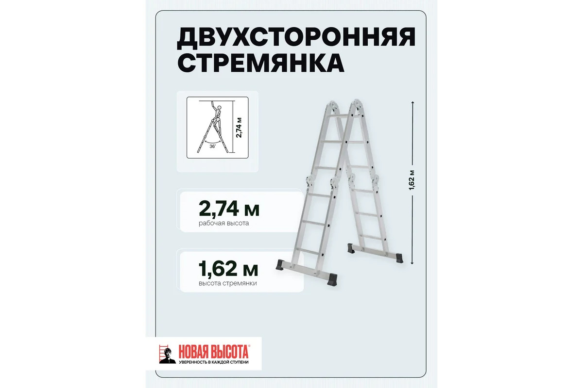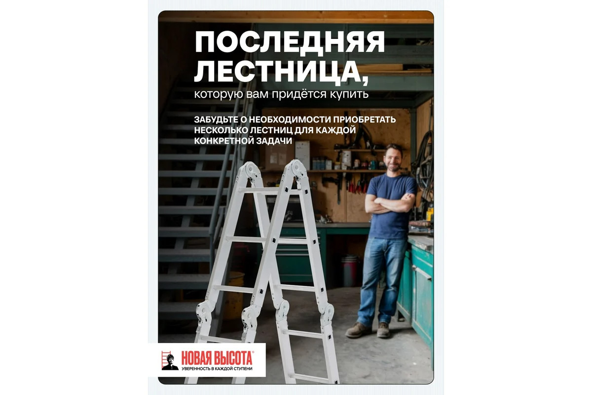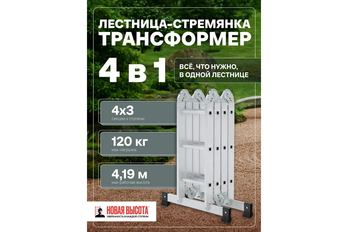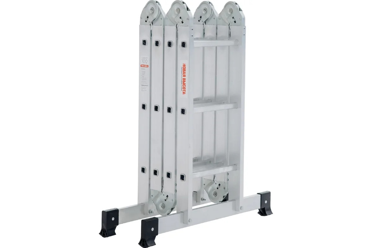 Четырехсекционная лестница-трансформер Новая Высота 4х3 ступени отличается универсальностью, компактностью при хранении, устойчивостью. Легко преобразуется в помост-платформу, стремянку, приставную лестницу, лестницу с выносом. Оснащена стойками с дополнительным усилением в наиболее нагруженных местах для повышения жесткости. Благодаря многократной развальцовке в соединении ступеней со стойками изделие имеет долгий срок службы.
