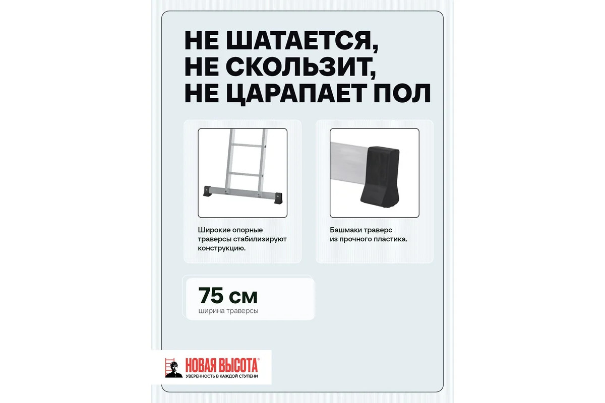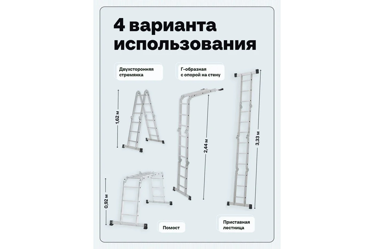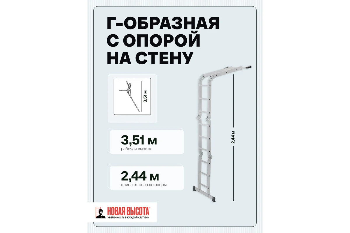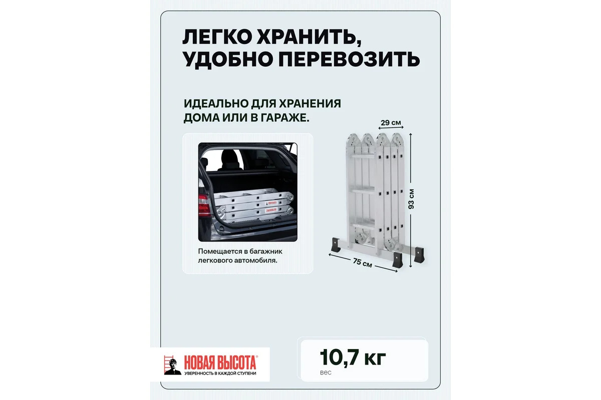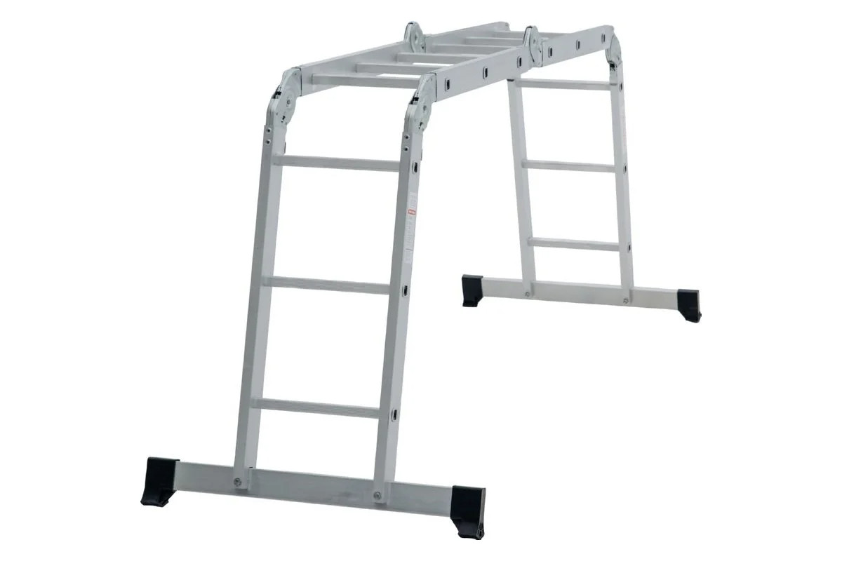 Четырехсекционная лестница-трансформер Новая Высота 4х3 ступени отличается универсальностью, компактностью при хранении, устойчивостью. Легко преобразуется в помост-платформу, стремянку, приставную лестницу, лестницу с выносом. Оснащена стойками с дополнительным усилением в наиболее нагруженных местах для повышения жесткости. Благодаря многократной развальцовке в соединении ступеней со стойками изделие имеет долгий срок службы.