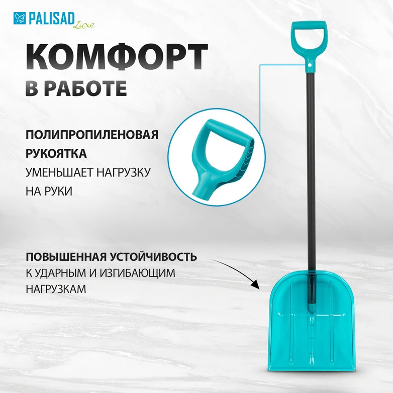 Лопата Palisad LUXE 61691 длиной 1340 мм, с ковшом из поликарбоната размером 340 х 385 мм и алюминиевым черенком, позволяет очистить от снега дорожки на загородном участке, тротуар, выезд из гаража и т.д. Вместительный ковш с увеличенными бортами позволяет убирать снег различной глубины. Благодаря заостренной кромке ковша лопата справляется даже с плотным снегом и наледью.