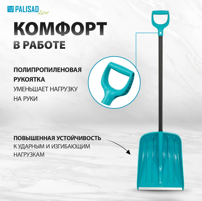 Лопата с ковшом из полипропилена предназначена для уборки снега. С ее помощью можно быстро очистить дорожку на дачном участке, тротуар, парковку, освободить от снежных заносов пространство перед подъездом и гаражом. Глубокий ковш с увеличенными бортами значительно повышает эффективность работы. Преимущества: - Морозостойкость — ковш изготовлен из полипропилена, выдерживающего температуру до -35 °C. - Устойчивость к ударным и изгибающим нагрузкам — ковш усилен ребрами жесткости. - Прочная конструкция — черенок изготовлен из алюминия, усиленная тулейка и кромка ковша устойчивы к излому и высоким нагрузкам. - Износостойкость — алюминиевая планка защищает кромку ковша от истирания и механических повреждений при работе с жестким снегом. - Защита от коррозии — черенок покрыт порошковой эмалью. - Эргономичность — усиленная дополнительная рукоятка позволяет равномерно распределять нагрузку.