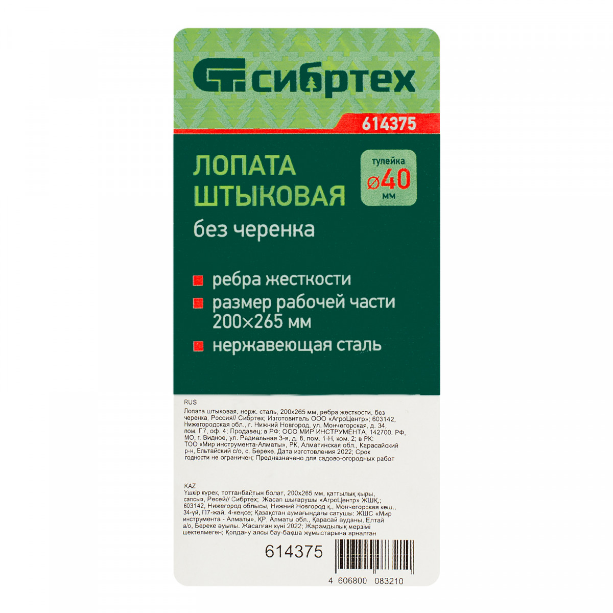 Лопата штыковая, нержавеющая сталь, 200х265 мм, ребра жесткости, без черенка, Сибртех