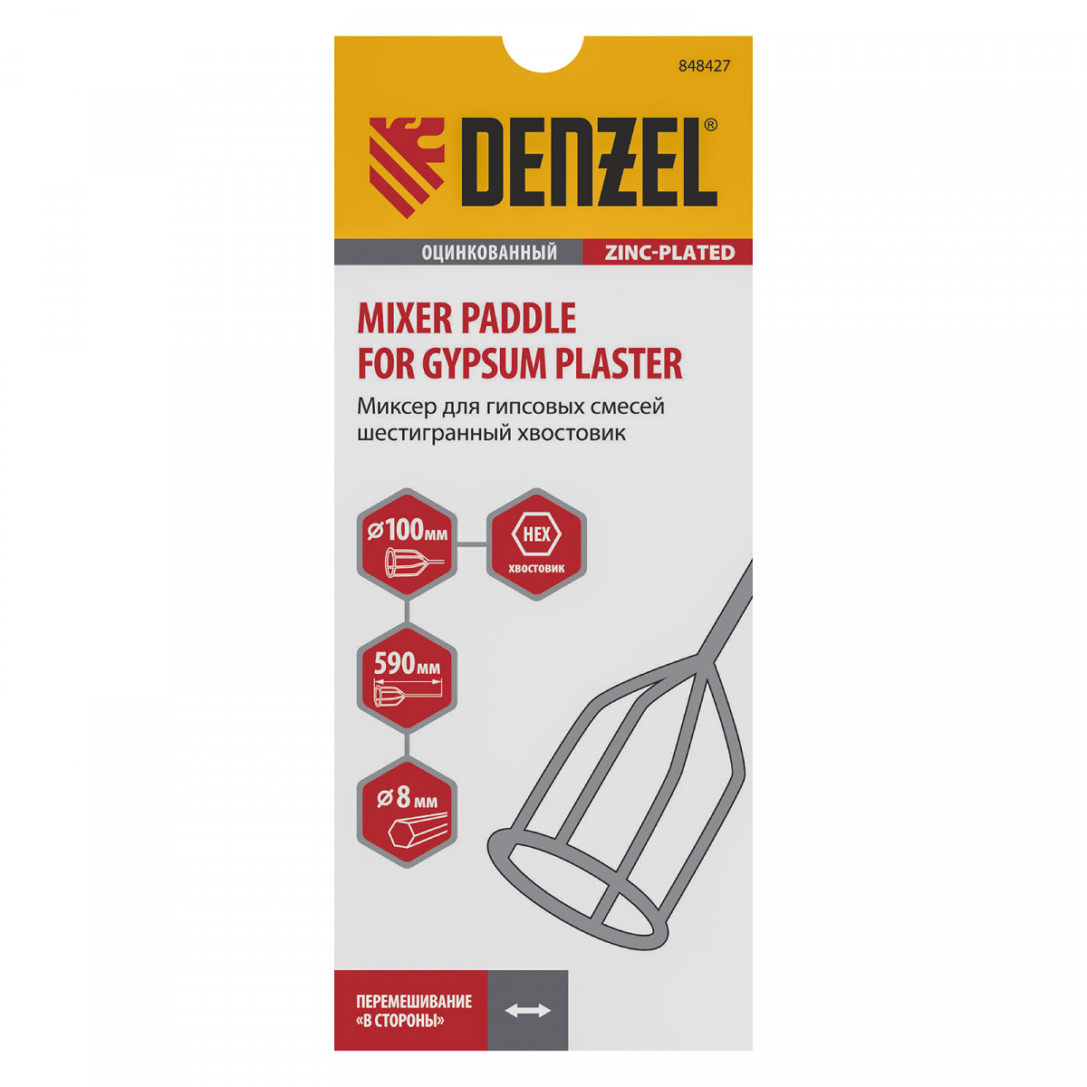 Миксер для гипсовых смесей, 100 х 590 мм, оцинкованный, шестигранный хвостовик 8 мм Denzel