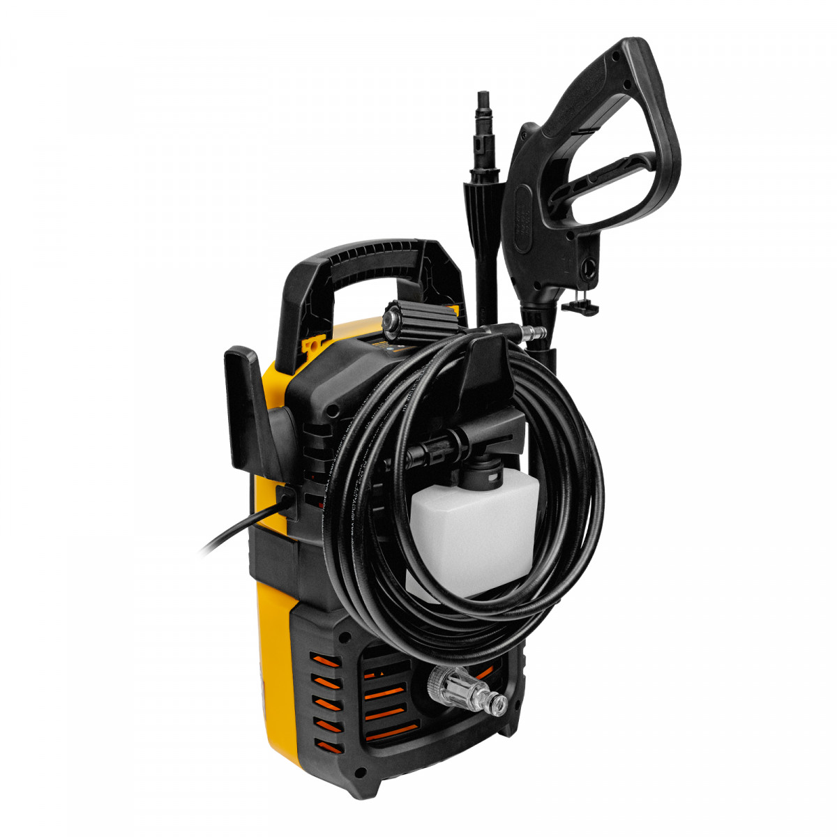 Мойка высокого давления, Шланг высокого давления, Пистолет моечный, Насадка-удлинитель пистолета, Регулируемая насадка-сопло, Пеногенератор с бачком для моющего средства, Входной штуцер с фильтром, Быстросъемный коннектор шланга, Игла для прочистки сопла, Кронштейн-держатель пистолета, Кронштейн для кабеля питания, Комплект крепежа, Инструкция по эксплуатации с гарантийным талоном