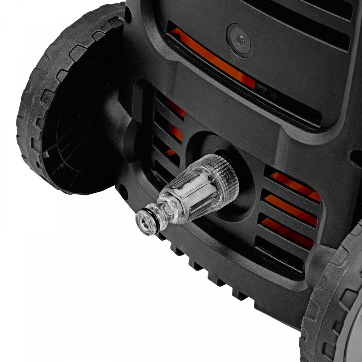 - Продуманная конструкция — кронштейны для шнура питания и шланга высокого давления, а также держатель для пистолета обеспечивают удобство хранения.