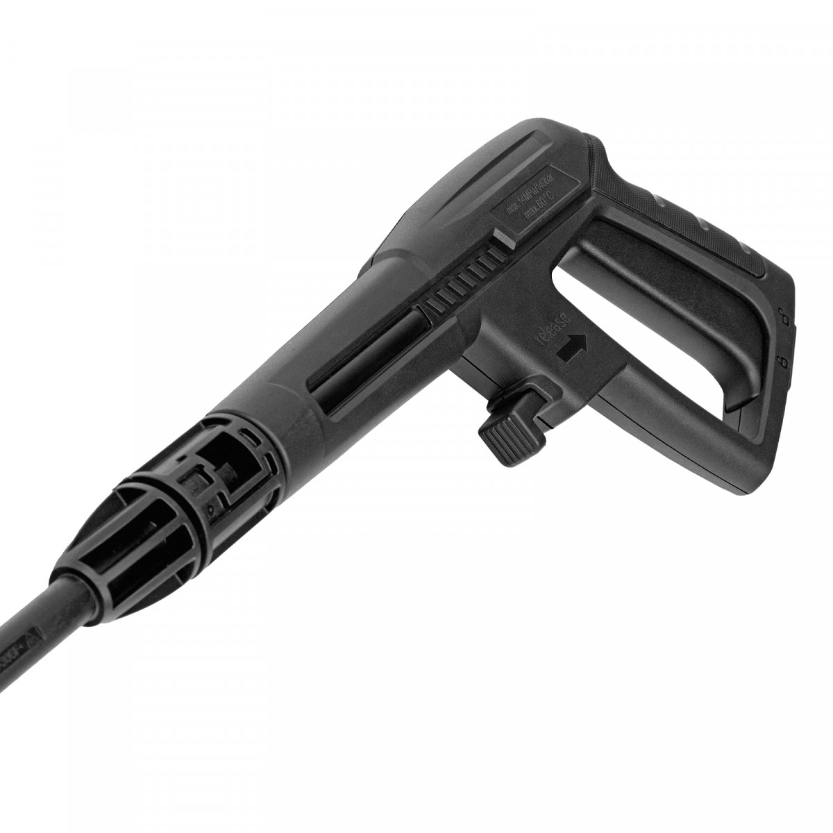 - Безопасность — перед началом работы необходимо разблокировать рычаг моечного пистолета для предотвращения случайного запуска.