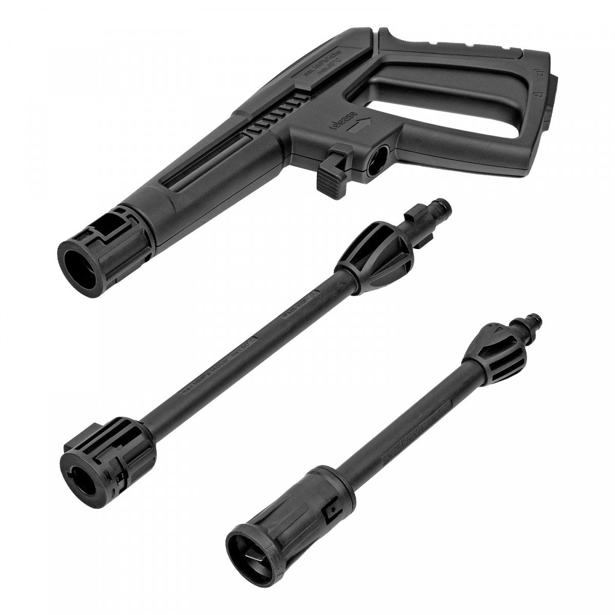 Мойка высокого давления - 1 штКронштейн для шланга - 1 штШланг высокого давления - 1 штПистолет - 1 штУдлинитель пистолета с регулируемым соплом - 1 штПеногенератор с бачком для моющего средства - 1 штВходной штуцер с фильтром - 1 штБыстросъемный коннектор шланга - 1 шткронштейн-держатель пистолета - 1 штКронштей сетевого кабеля - 1 штИгла для прочистки сопла - 1 штКомплект крепежа - 1 штИнструкция с гарантийным талоном - 1 шт