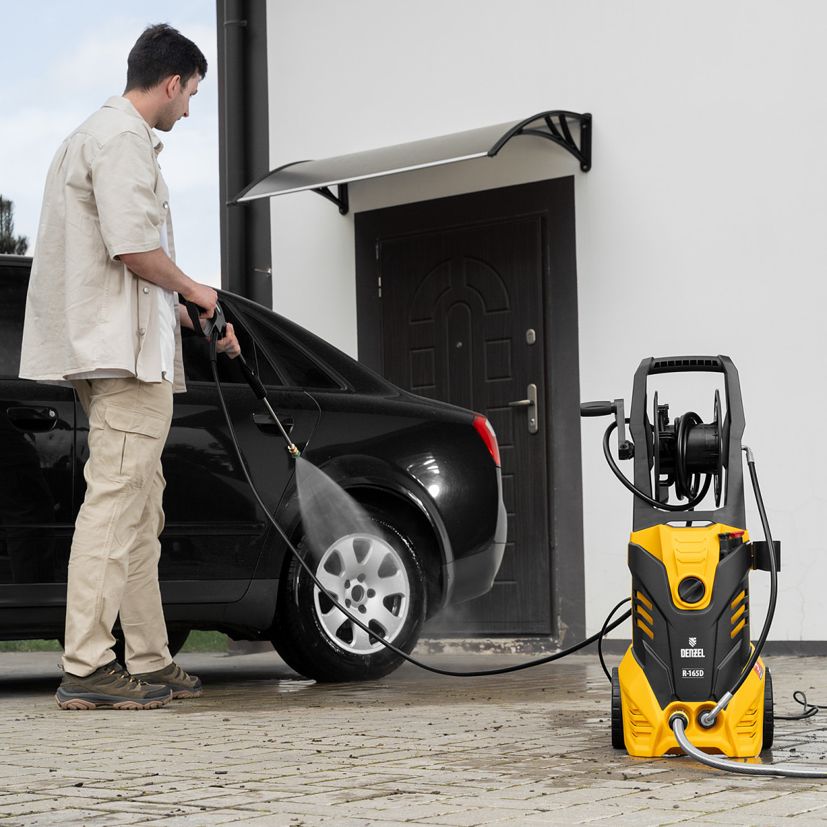 Колесная моечная машина высокого давления Denzel R-165D 58235 производительностью 7 л/мин, мощностью 2200 Вт, с максимальным давлением 165 бар, используется для мытья автомобилей, садового инвентаря, велосипедов, дорожек и заборов. Мощный мотор и помпа высокой производительности позволяют быстро справляться даже с серьезными загрязнениями. Если нет доступа к водопроводу, мойка может осуществлять забор воды из резервуара в режиме самовсасывания, теряя при этом всего 5% давления.