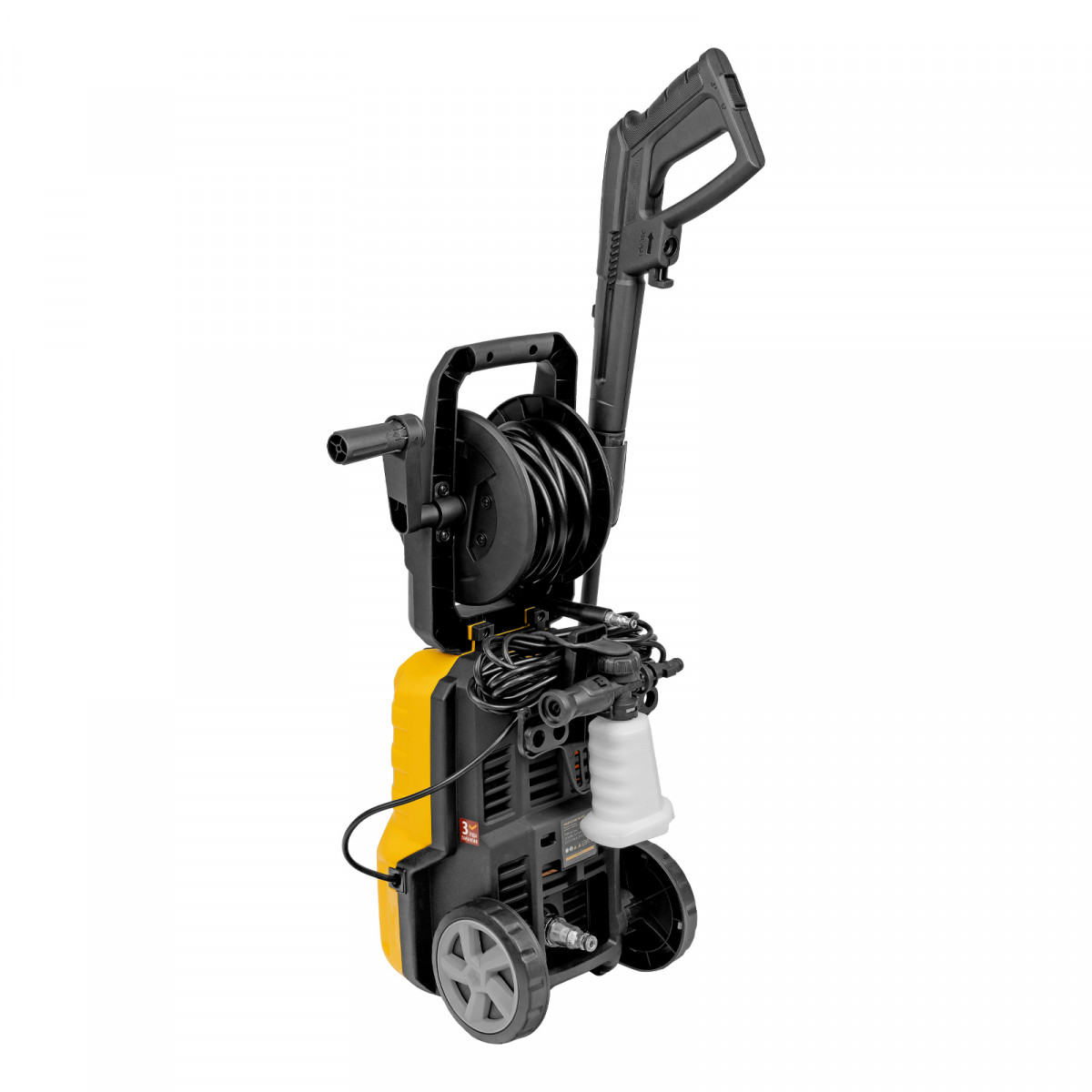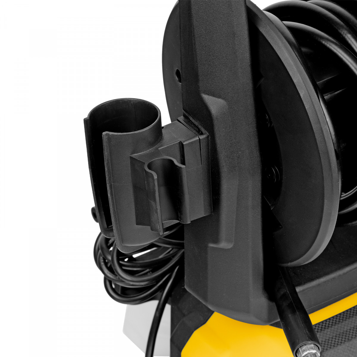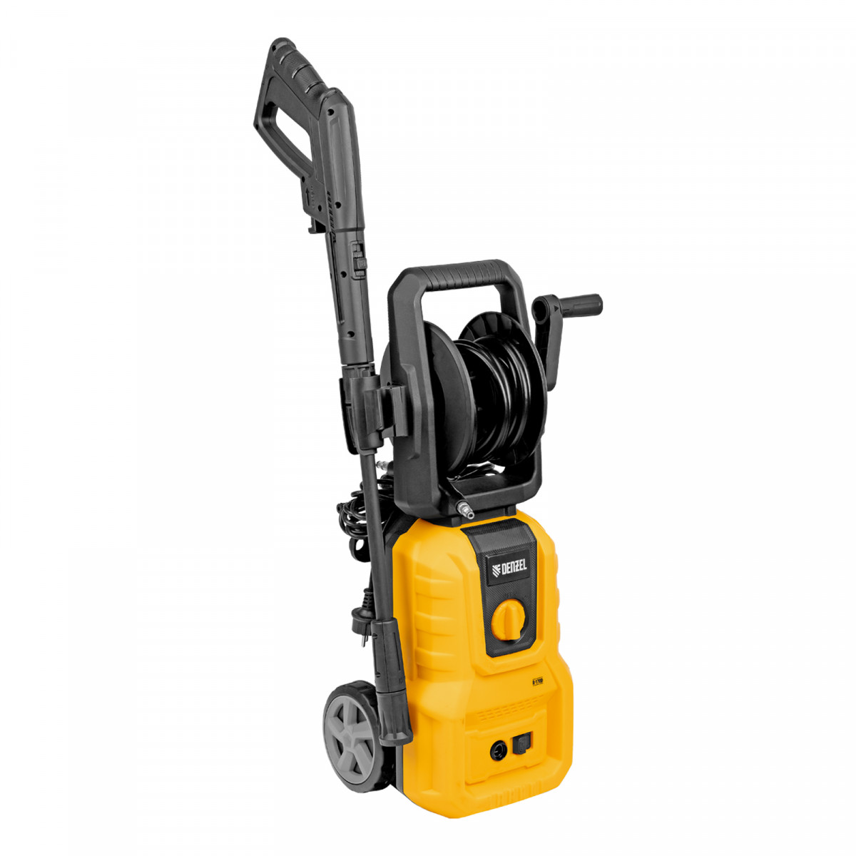 - Комфортная эксплуатация — барабан для шланга высокого давления упрощает работу, длина кабеля и шланга высокого давления составляет 5 м, что позволяет свободно передвигаться по участку.