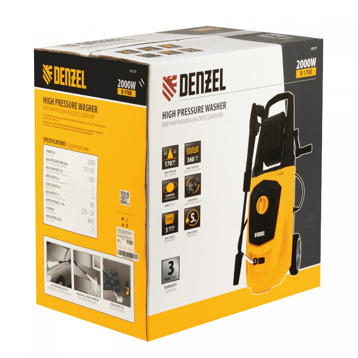 Моечная машина высокого давления Denzel R-170D 58229 с барабаном, мощностью 2000 Вт и производительностью 360 л/ч, подает струю воды под давлением 170 бар и используется для очищения поверхностей. Позволяет быстро удалить загрязнения с кузова автомобиля, мотоцикла, велосипеда, садового и хозяйственного инвентаря, очистить садовую дорожку и террасу, а также стены и окна строений. Источником воды может служить водопроводная линия, а также любая емкость — машина способна работать в режиме самовсасывания. Мойка пригодится владельцам загородных участков.