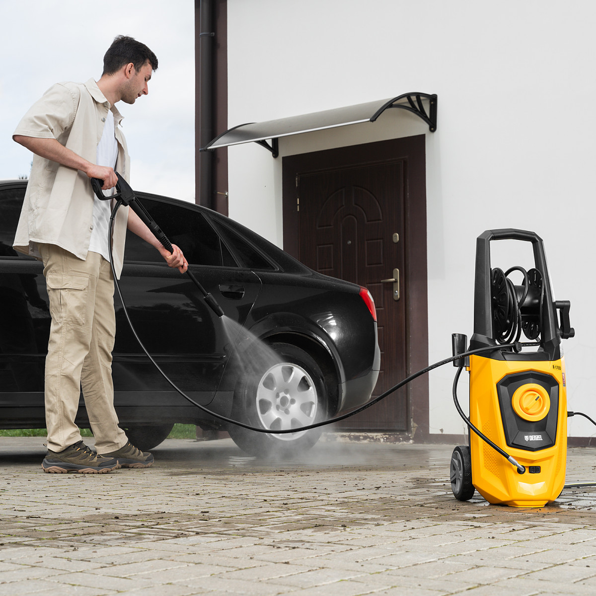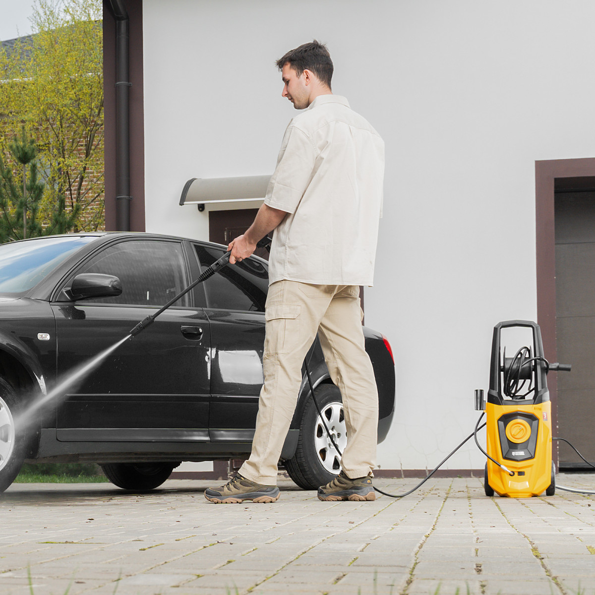 • Длина шланга и кабеля 5 м — не нужно часто перемещать машину, можно работать на удалении от розетки.