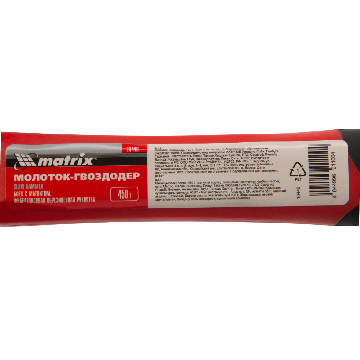 Молоток-гвоздодер, 450 г, боек c магнитом, фибергласовая обрезиненная рукоятка Matrix