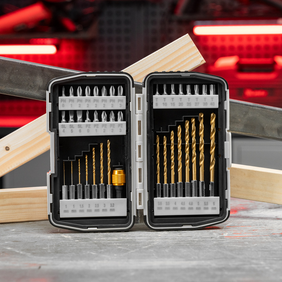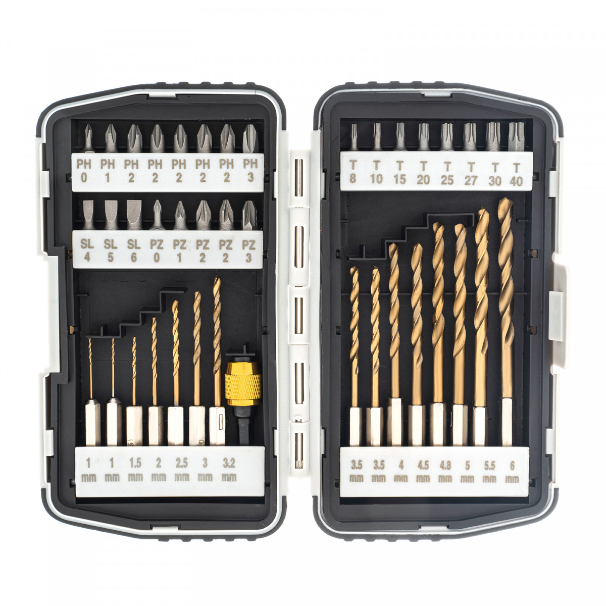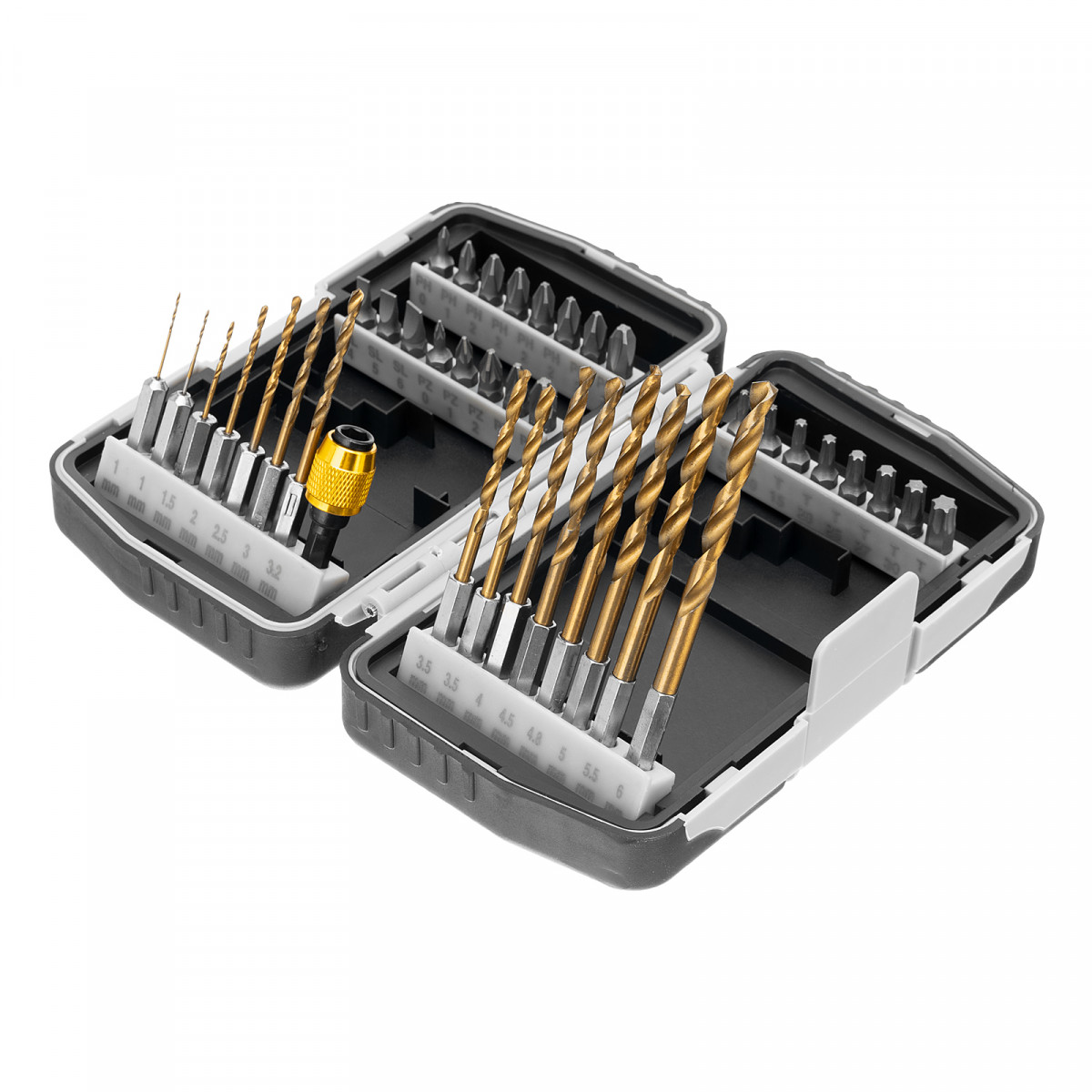 Набор Matrix 11322, упакованный в пластиковый бокс, состоит из 40 предметов: бит из стали CrV и сверл с посадочным размером 1/4 дюйма, а также магнитного адаптера. Предназначен для работы с шуруповертами и подходит для решения широкого спектра задач, т.к. включает 24 биты (PH и PZ № 0-3, SL № 4-6, T № 8, 10, 15, 20, 25, 27, 30, 40) и 15 сверл диаметром 1-6 мм. Оснастки применяются для монтажа шурупов и саморезов, а также для сверления отверстий в металле.
