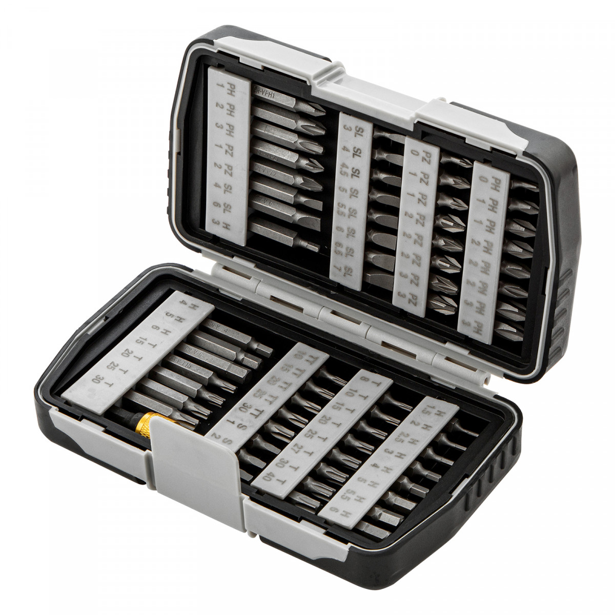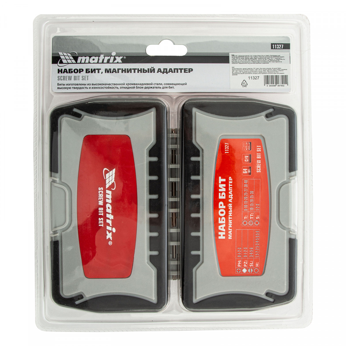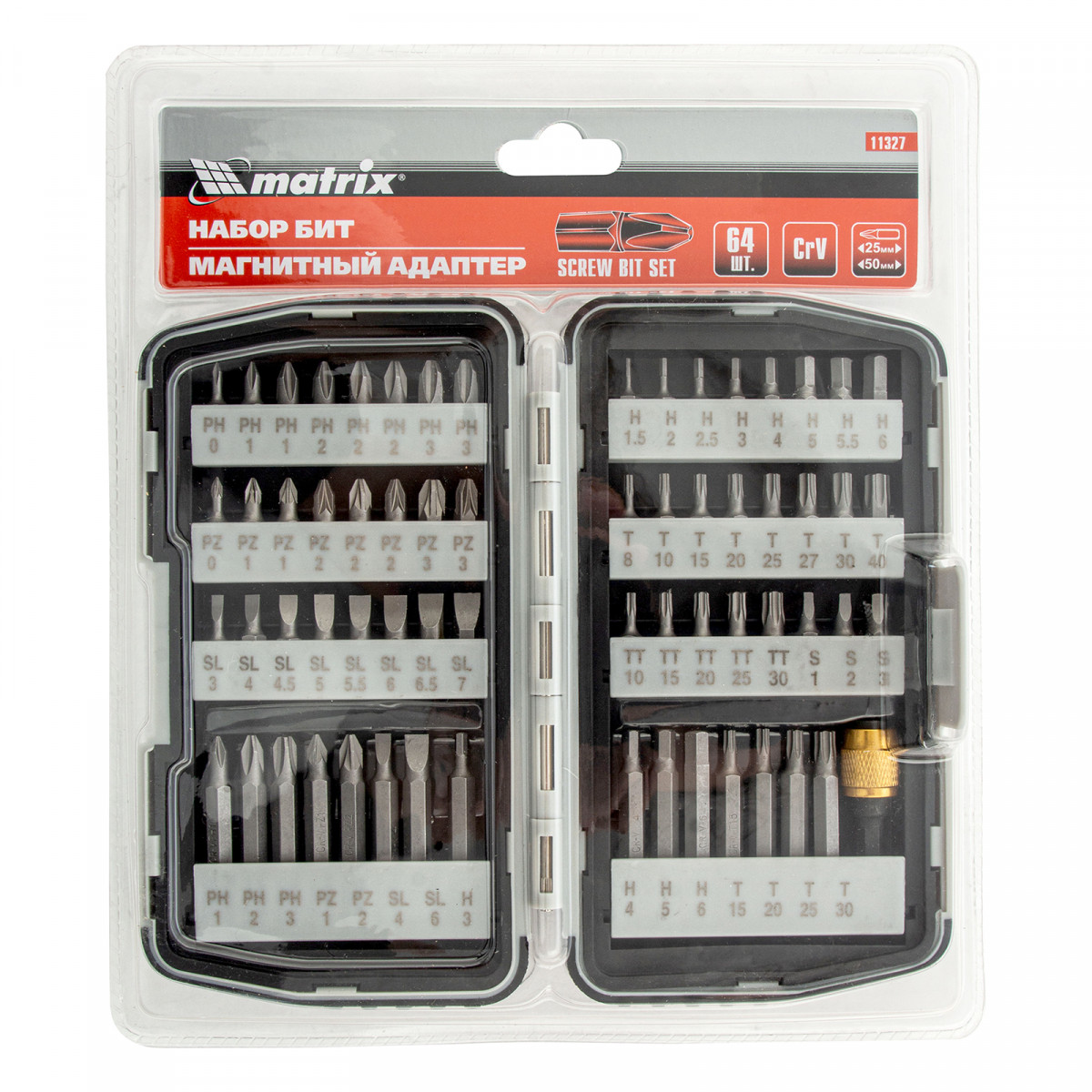 Набор Matrix 11327 состоит из 64 предметов, упакованных в пластиковый бокс, и включает биты из стали CrV и магнитный адаптер. Кроме бит длиной 25 мм в комплект входит 15 насадок длиной 50 мм для работы в труднодоступных местах. Оснастки используются совместно с шуруповертами и отвертками для монтажа и демонтажа резьбовых соединений.