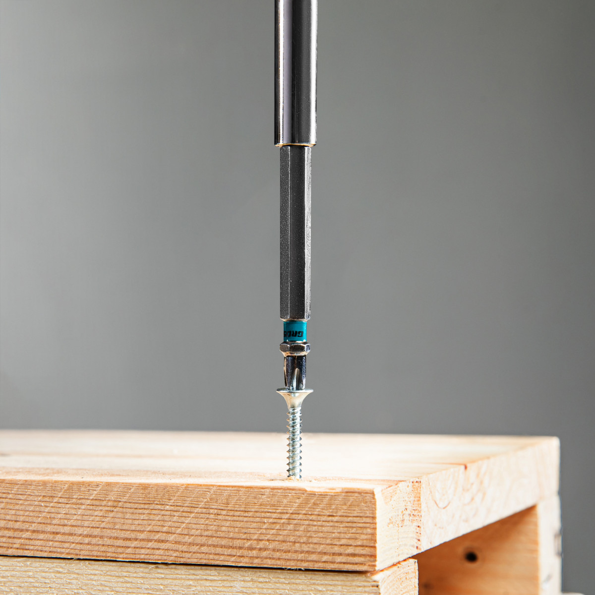 • Удобная эксплуатация — намагниченный шлиц облегчает работу и позволяет направлять шуруповерт с насаженным крепежом одной рукой, а другой придерживать закрепляемую деталь.