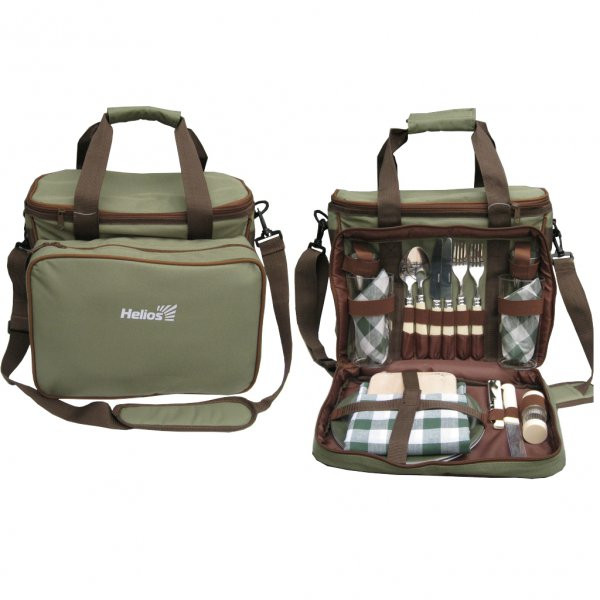 Набор для пикника HS-811(2) Helios позволит комфортно отдохнуть с друзьями и семьей на природе. Удобный и компактный, он не займет много места при транспортировке, при этом в нем есть все, самое необходимое для отличного пикника на свежем воздухе. Набор для пикника на 2 персоны включает 2 тарелки, 2 бокала, 2 стопки, 2 ложки, 2 вилки, 2 ножа, 1 разделочный нож, 1 штопор-открывашка, 1 доска разделочная, 1 солонка, 1 скатерть, 2 салфетки. Большое теплоизолированное основное отделение под продукты.Материал сумки: Полиэстер 600 D.