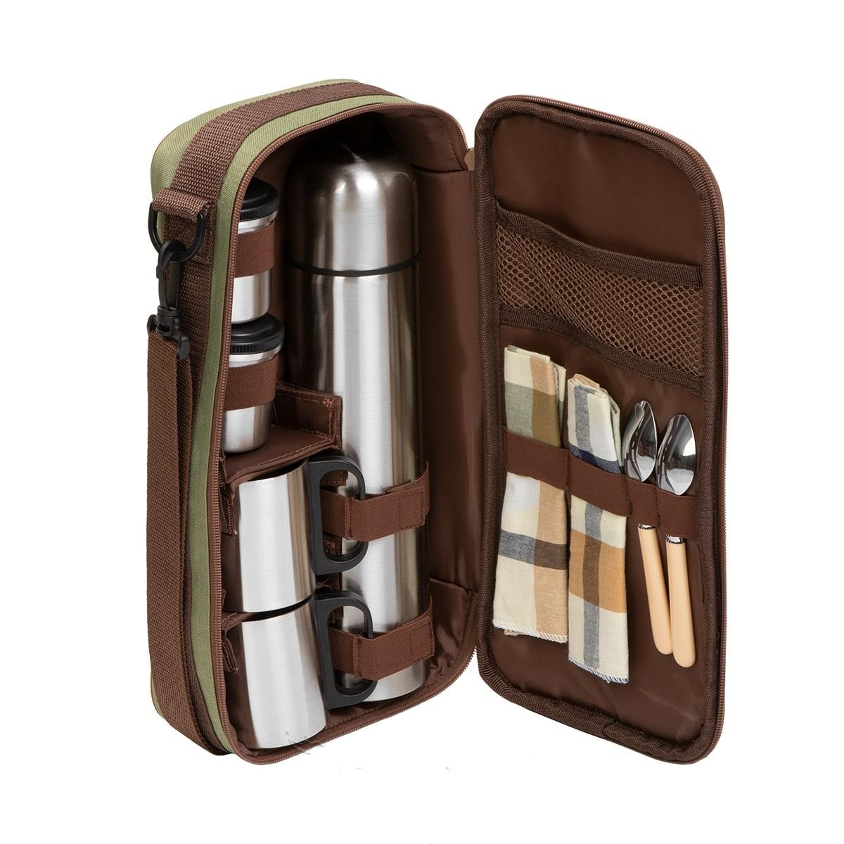Удобный и компактный дорожный набор, не займет много места при транспортировке, при этом в нем есть принадлежности для отличного чаепития вдвоем на свежем воздухе.
