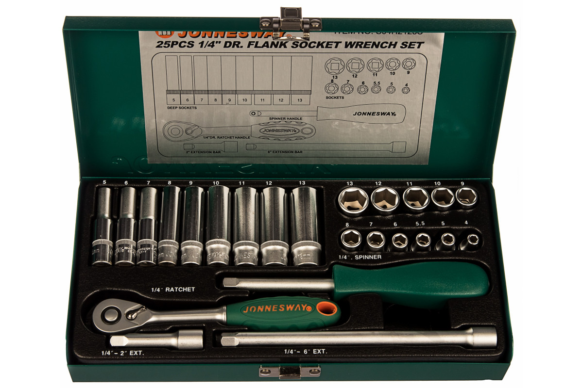 Набор головок торцевых JONNESWAY стандартных и глубоких 1/4"DR 4-13 мм 25 предметов