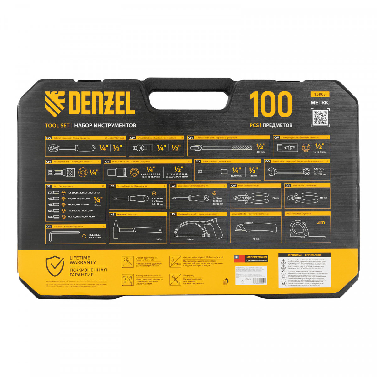 Набор инструментов Denzel 15803 состоит из 100 предметов с присоединительными квадратами 1/4″ и 1/2″, упакованных во вместительный ударопрочный кейс собственной разработки с антивандальным покрытием. В комплект поставки входят инструменты и оснастка для монтажа и демонтажа резьбовых соединений, а также молоток, плоскогубцы, бокорезы, ножовка по металлу для выполнения слесарных работ, рулетка для проведения измерений и нож для резки материалов. Набор предназначен для профессионального использования в автомастерской, будет полезен и для решения бытовых вопросов.