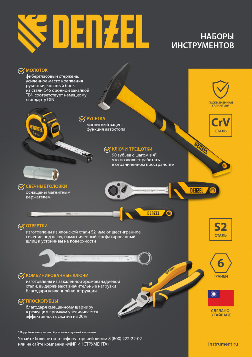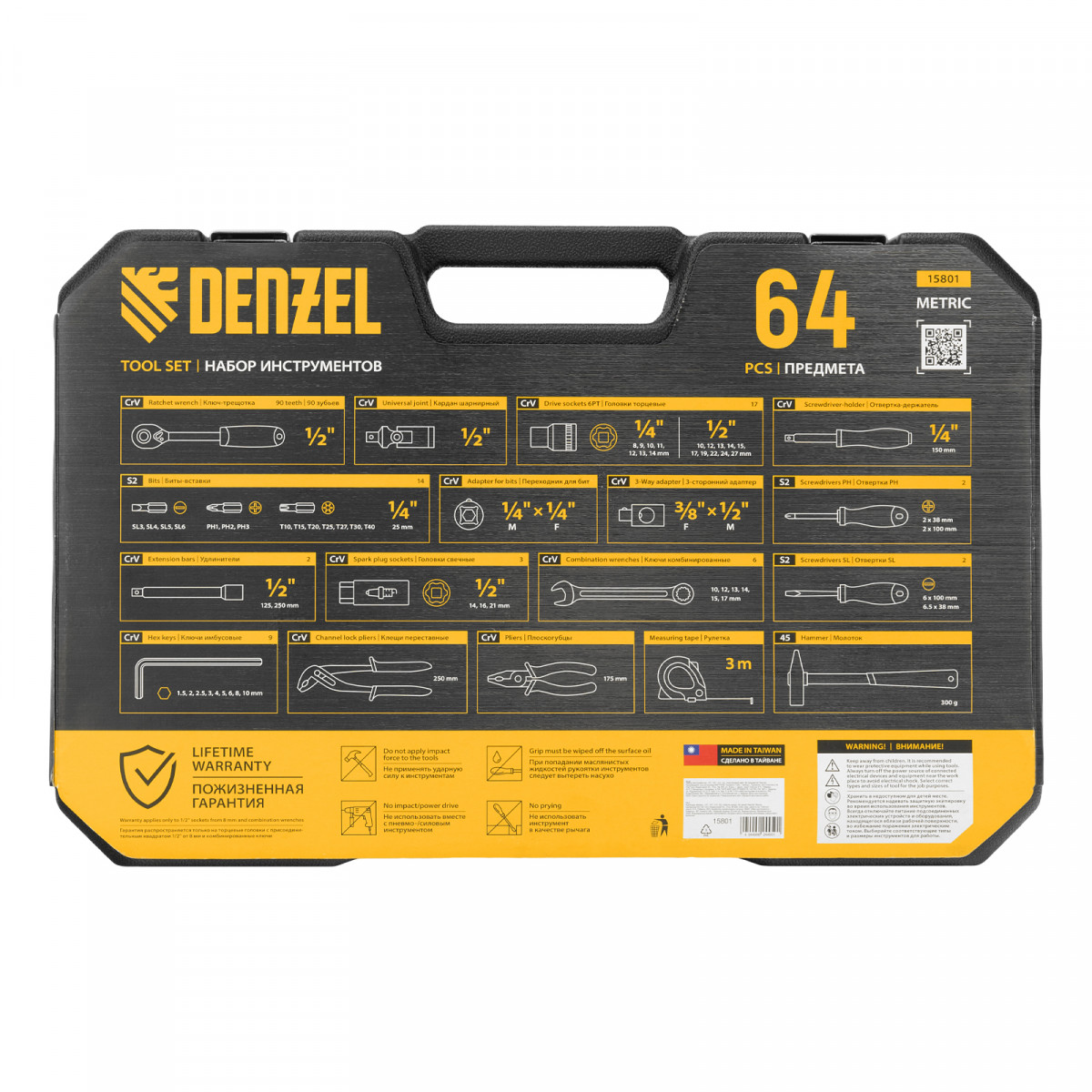 Набор инструментов Denzel 15801 состоит из 64 предметов с присоединительными квадратами 1/4″ и 1/2″, упакованных во вместительный ударопрочный кейс собственной разработки с антивандальным покрытием. В комплект поставки входят инструменты и оснастка для монтажа и демонтажа резьбовых соединений, а также молоток, плоскогубцы, переставные клещи для выполнения слесарных и сантехнических работ и рулетка для проведения измерений. Набор предназначен для профессионального использования в автомастерской, будет полезен и для решения бытовых вопросов.