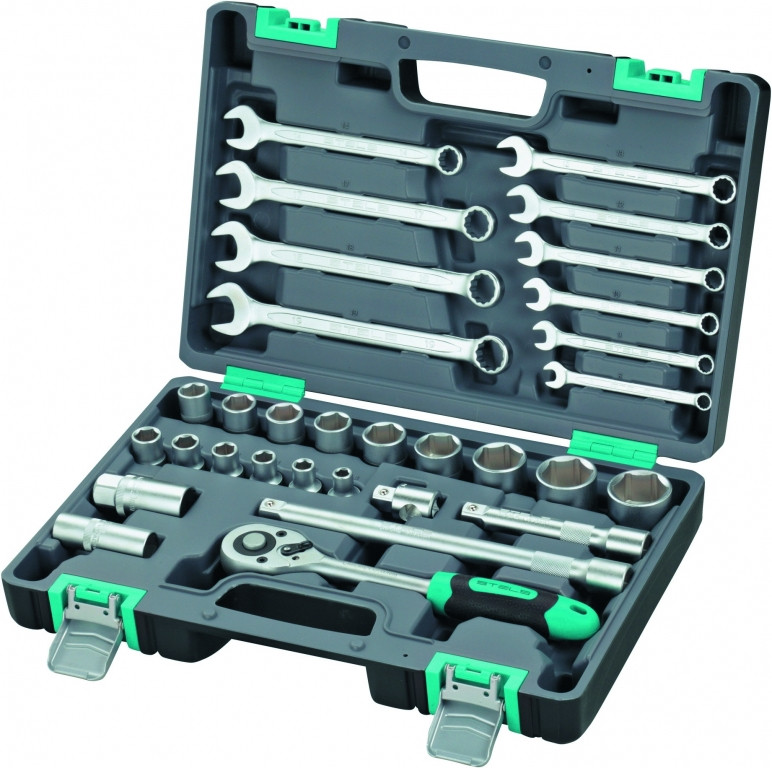 Набор инструментов STELS 31 предмет 14102 - это комплект необходимых для обслуживания и ремонта автомобиля изделий, производство которых происходило под контролем и в соответствии с международными стандартами. В качестве материала для рабочих частей головок и ключей использована хромованадиевая сталь. Кейс выполнен из противоударного пластика, обладает ручкой и защелками. В наборе 31 инструмент.