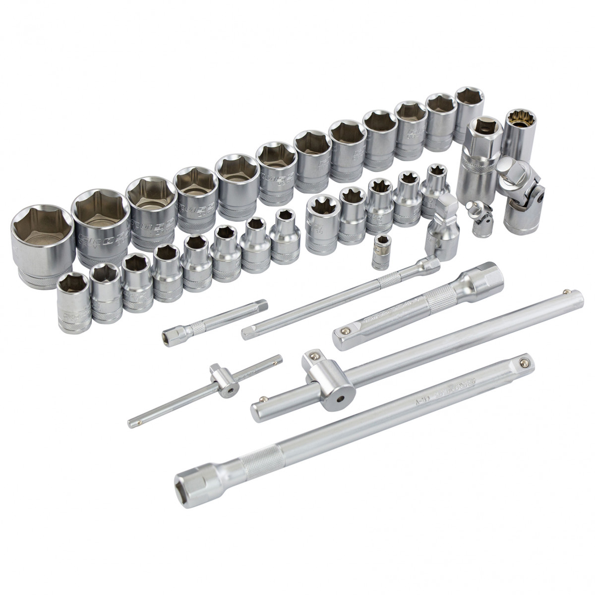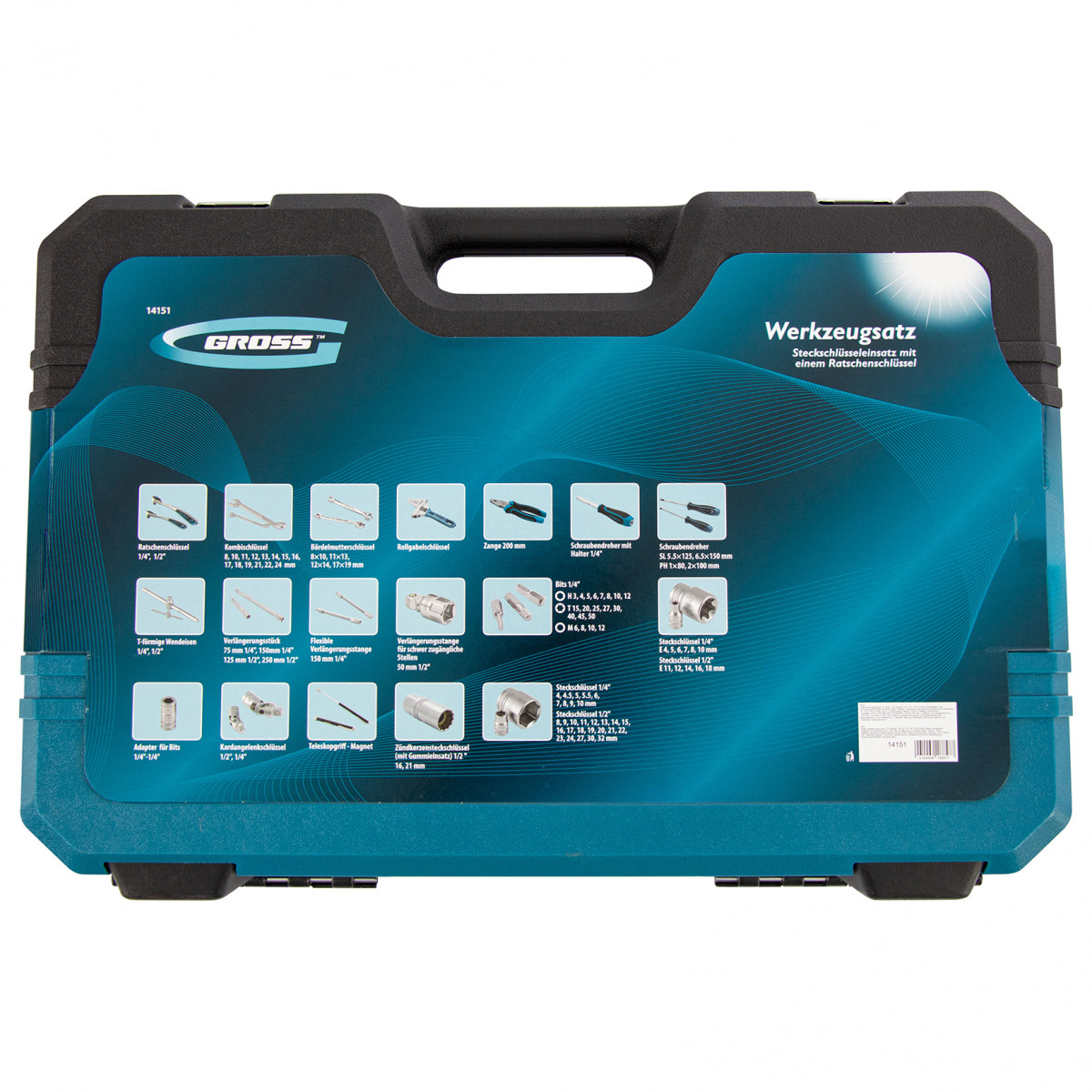 Набор инструментов Gross 14151 включает в себя 101 предмет, в том числе ключи-трещотки из стали CrV со 120 зубьями, с присоединительным размером 1/4" и 1/2", а также разводной ключ и плоскогубцы. Инструменты используются для монтажа и демонтажа резьбовых соединений, плоскогубцы служат для захвата и удержания деталей. Воротки, удлинители и карданные шарниры облегчают работу в стесненных условиях. Набор пригодится водителям, сотрудникам автосервисов, а также домашним мастерам.