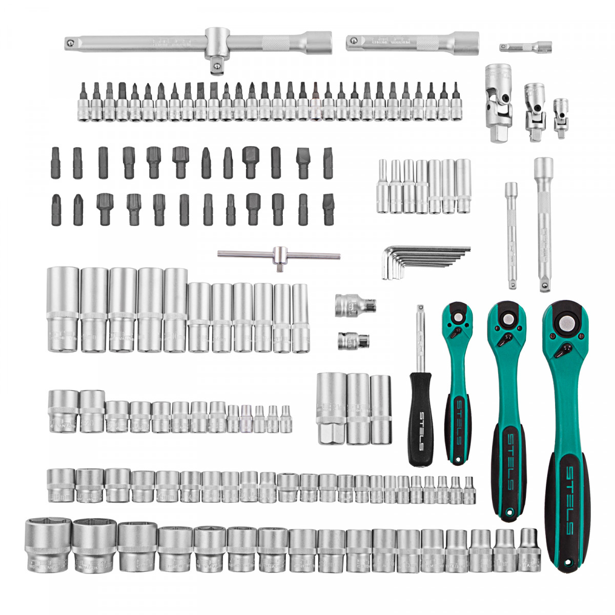 Набор инструментов Stels 14114 в ударопрочным пластиковом кейсе состоит из 151 предметов с присоединительными квадратами 1/2″ , 1/4″ и 3/8″, из стали CrV и S2, и предназначен для выполнения слесарно-монтажных работ. Включает инструменты и насадки для работы с резьбовыми крепежами, а также удлинители и т-образный вороток, облегчающие работу в труднодоступных местах. Набор предназначен для профессионального использования в автомастерской, будет полезен и для решения бытовых задач.