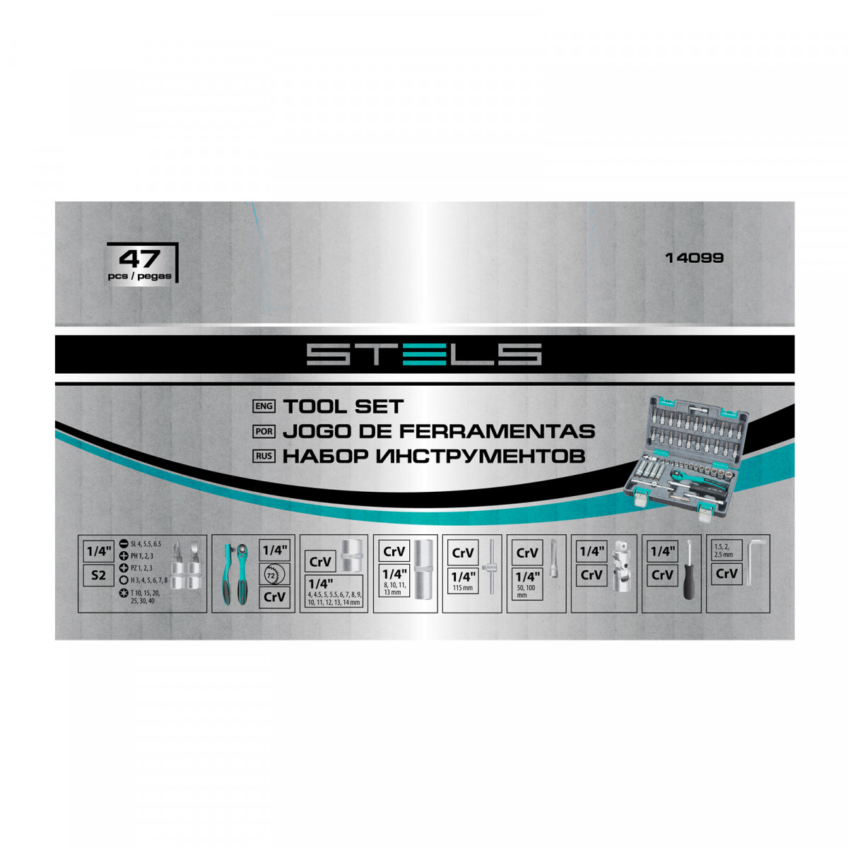 Набор инструментов, 1/4", Cr-V, S2, усиленный кейс, 47 предметов Stels