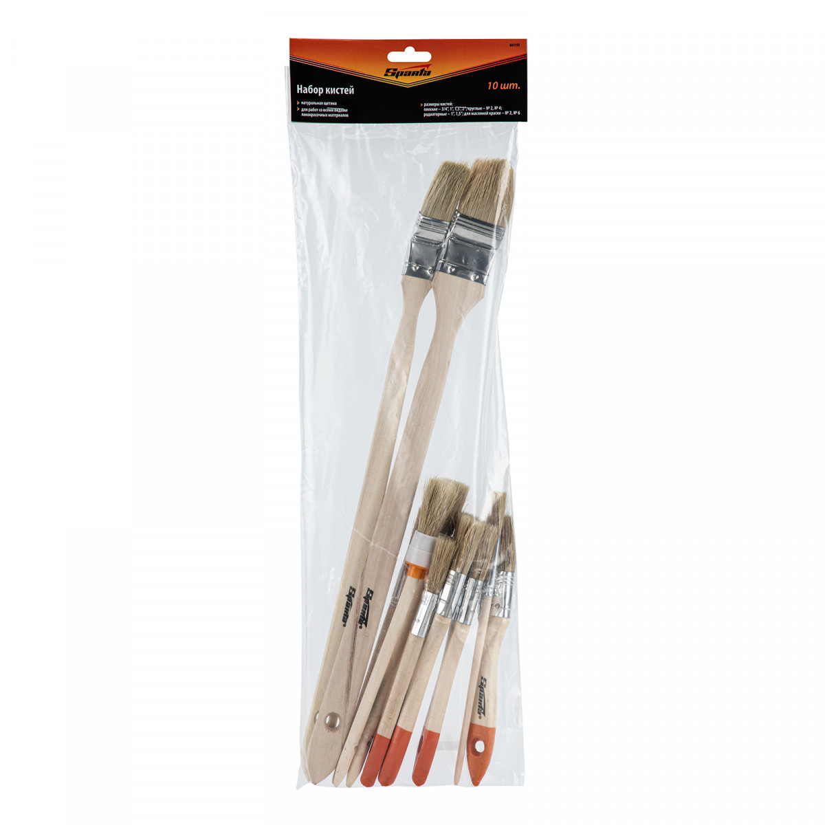 Набор Sparta 841155 включает 10 кистей: плоские шириной 3/4-2 дюйма, круглые №2, №4, радиаторные шириной 1, 1,5 дюйма и кисти для масляных красок №2,6. Предназначен для проведения покрасочных работ. Кисти с натуральной щетиной оптимальны для нанесения составов на основе растворителей, а также масляных красок. С их помощью можно получить равномерное финишное покрытие.